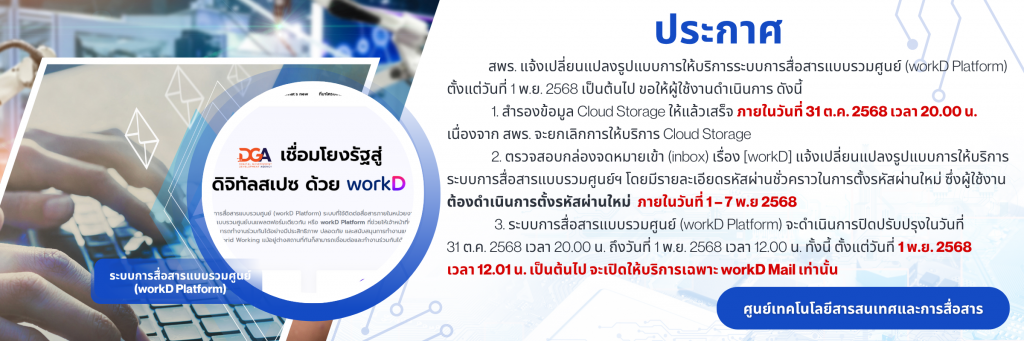 สพร. แจ้งเปลี่ยนแปลงรูปแบบการให้บริการระบบการสื่อสารแบบรวมศูนย์ (workD Platform) ตั้งแต่วันที่ 1 พฤศจิกายน 2568 เป็นต้นไป