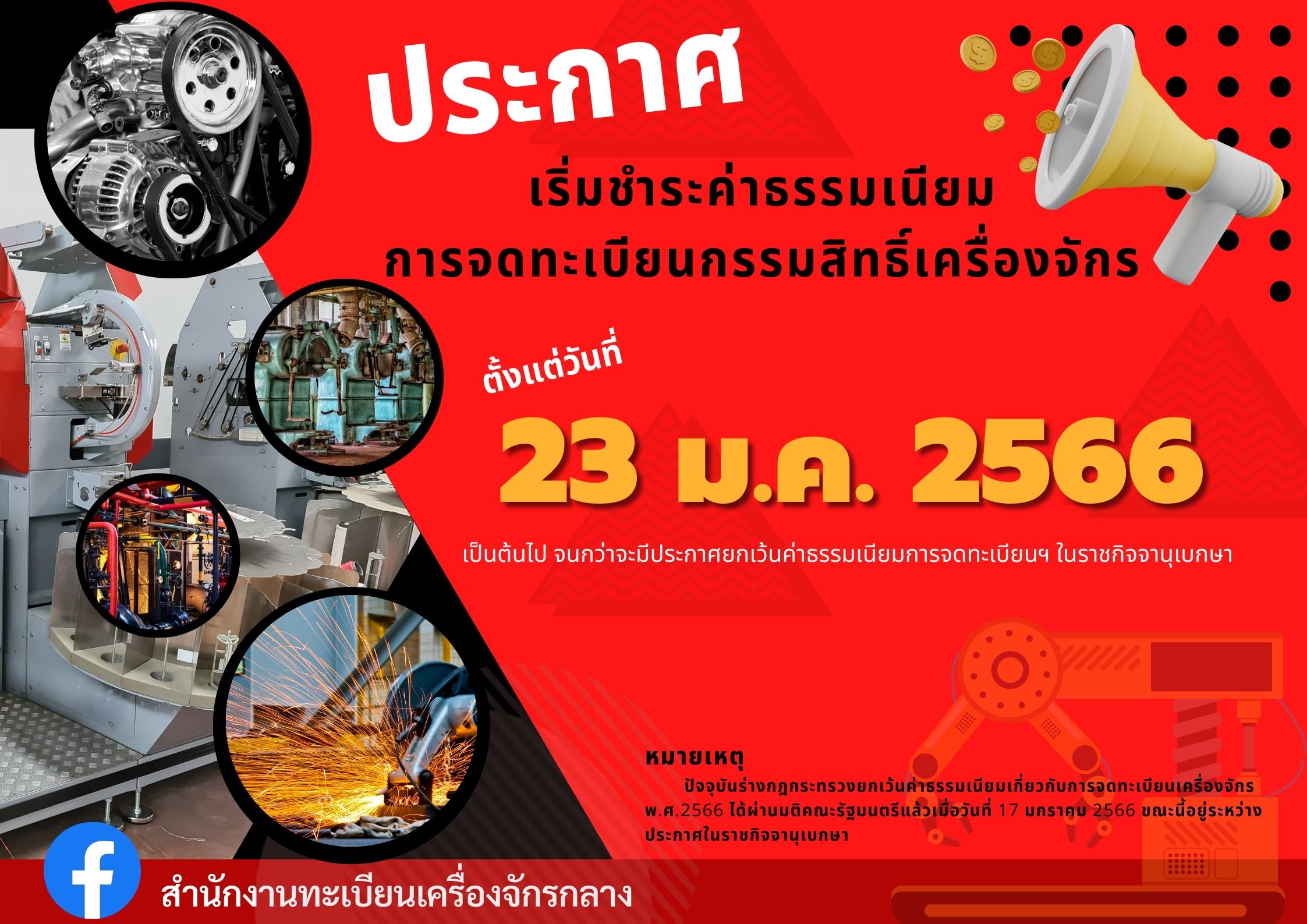 เริ่มชำระค่าธรรมเนียมการจดทะเบียนกรรมสิทธิ์เครื่องจักร ตั้งแต่วันที่ 23 มกราคม 2566 เป็นต้นไป จนกว่าจะมีประกาศยกเว้นค่าธรรมเนียมการจดทะเบียนฯ ในราชกิจจานุเบกษา