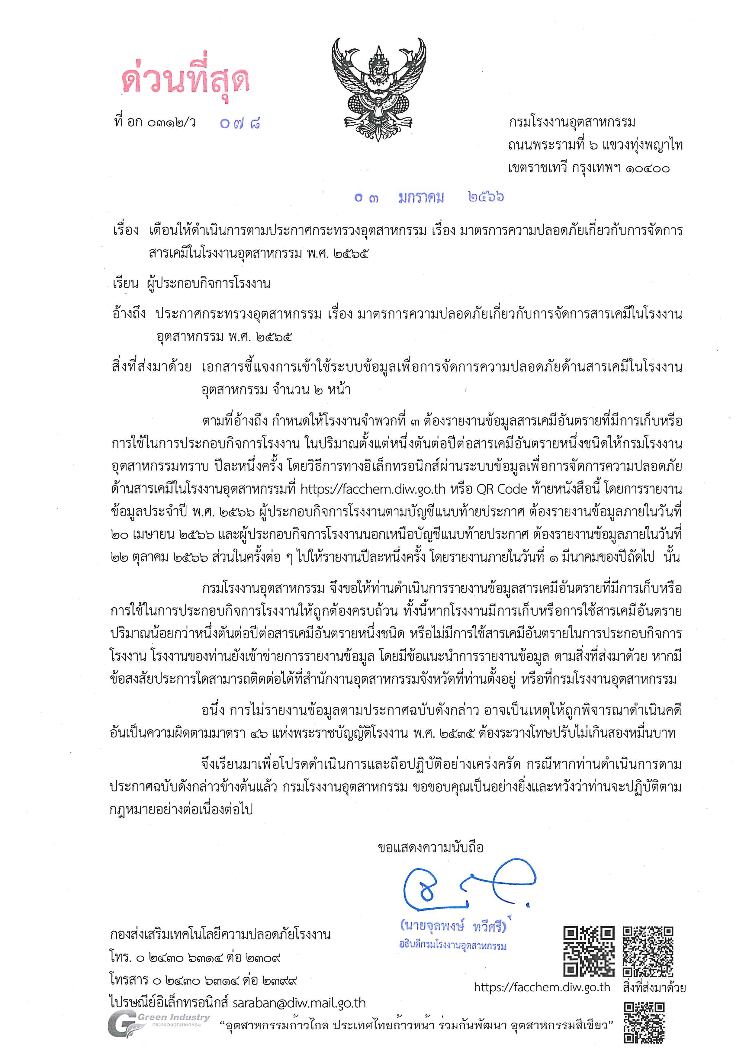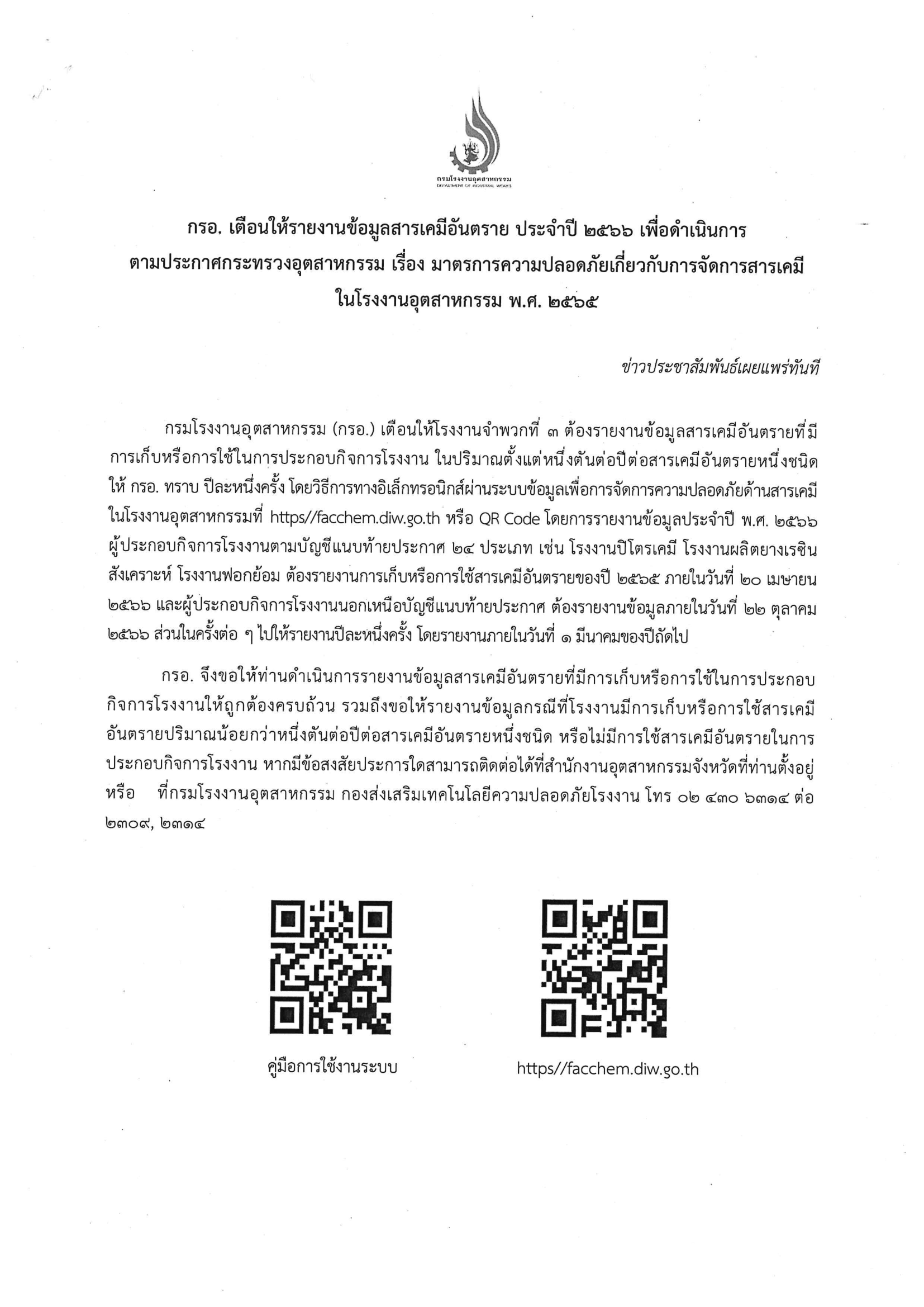 กรมโรงงานอุตสาหกรรม เตือนให้รายงานข้อมูลสารเคมีอันตราย ประจำปี 2566 เพื่อดำเนินการตามประกาศกระทรวงอุตสาหกรรม