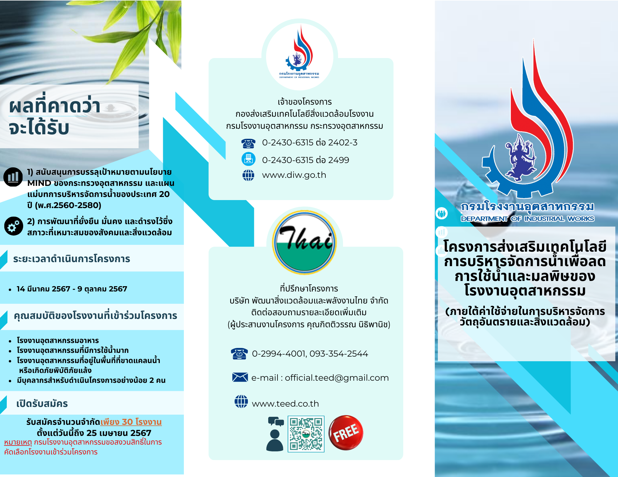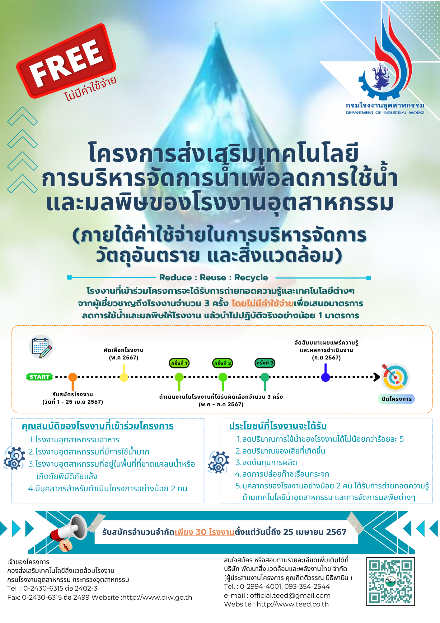 ขอเชิญเข้าร่วม “โครงการส่งเสริมเทคโนโลยีดารบริหารจัดการน้ำเพื่อลดการใช้น้ำและมลพิษของโรงงานอุตสาหกรรม” (ภายใต้ค่าใช้จ่ายในการบริหารจัดการวัตถุอันตรายและสิ่งแวดล้อม)