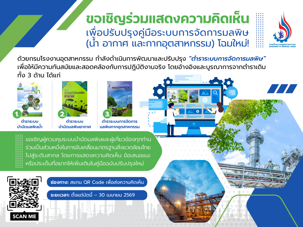 ขอเชิญผู้ที่เกี่ยวข้องร่วมแสดงความคิดเห็นเพื่อปรับปรุงคู่มือการจัดการมลพิษ (น้ำ อากาศ และกากอุตสาหกรรม) ตั้งแต่บัดนี้ – 30 เมษายน 2569