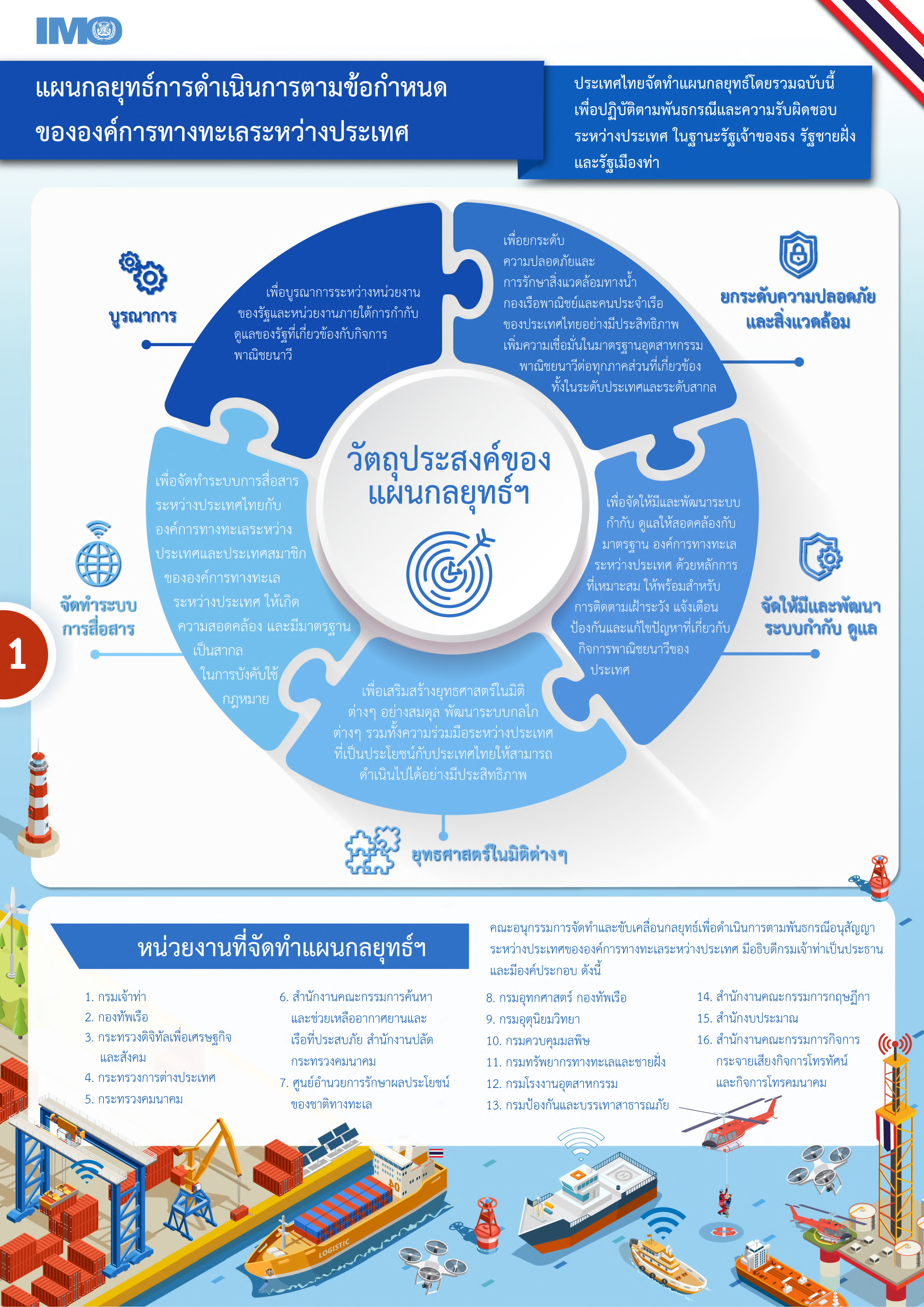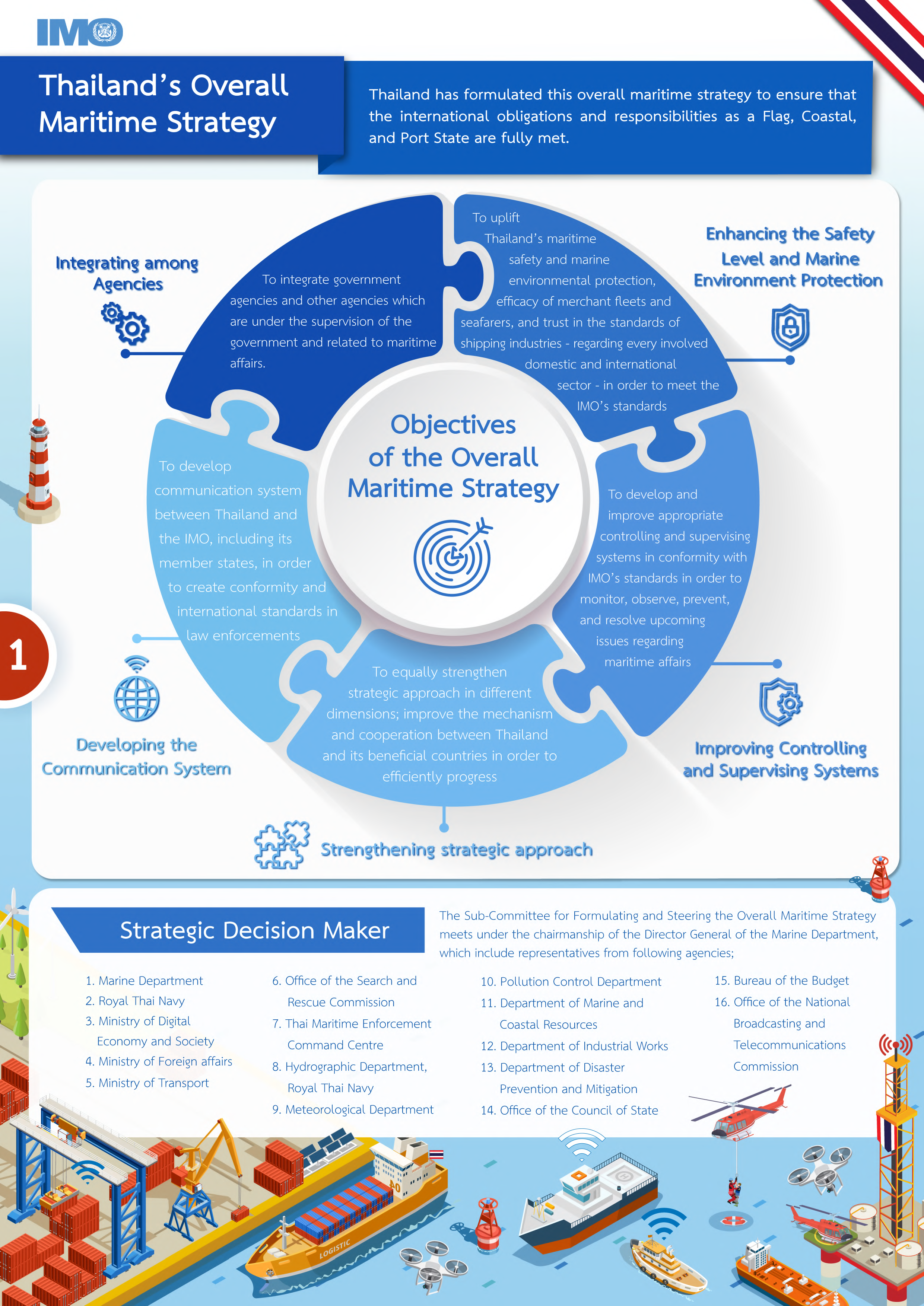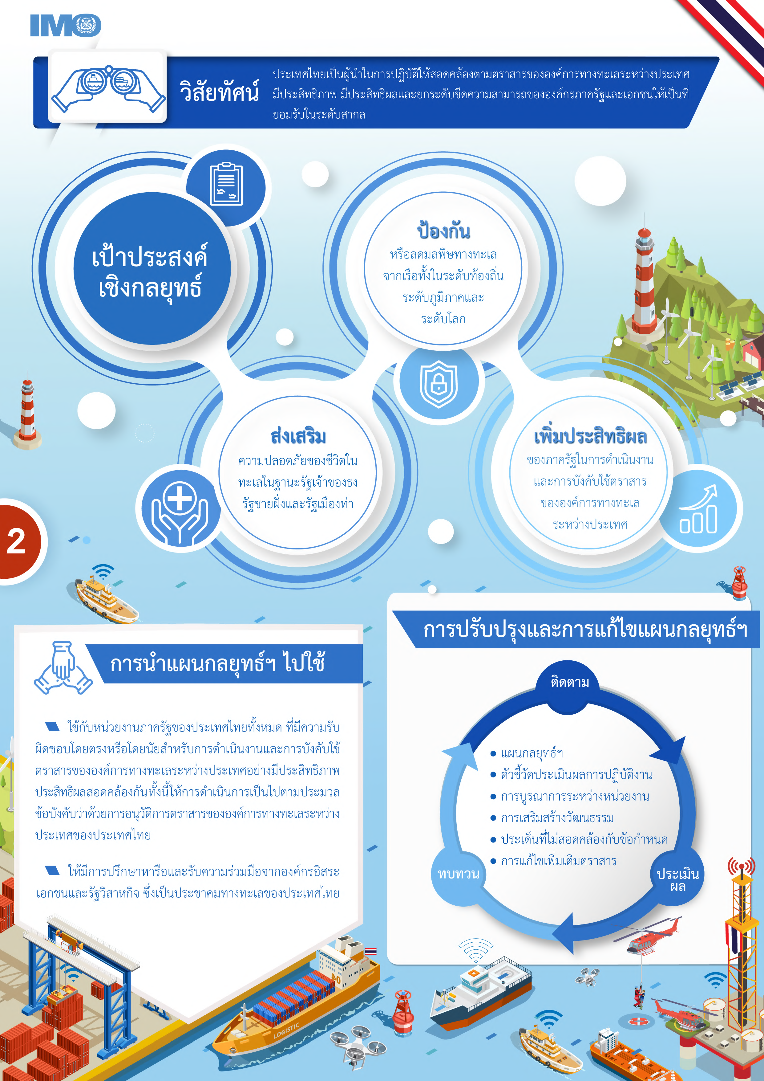 สามารถดูรายละเอียดเพิ่มเติมได้ที่ แผนกลยุทธ์การดำเนินการตามข้อกำหนดขององค์การทางทะเลระหว่างประเทศ Thailand’s Overall Maritime Strategy คลิก