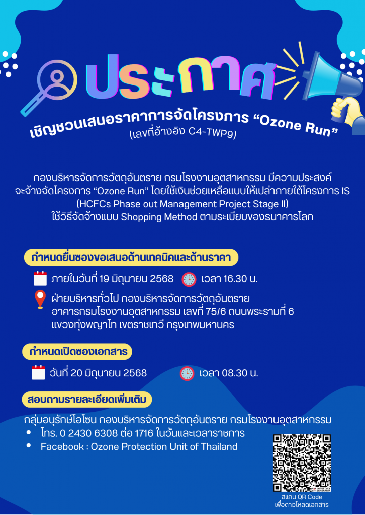 ประกาศเชิญชวนเสนอราคาการจัดโครงการ “Ozone Run” กำหนดยื่นซองข้อเสนอฯ ภายในวันที่ 19 มิถุนายน 2568 ณ กองบริหารจัดการวัตถุอันตราย กรมโรงงานอุตสาหกรรม