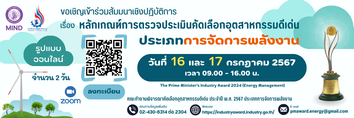 ขอเชิญเข้าร่วมสัมมนาเชิงปฏิบัติการ เรื่อง หลักเกณฑ์การตรวจประเมินคัดเลือกอุตสาหกรรมดีเด่น ประเภทการจัดการพลังงาน จำนวน 2 วัน ในวันที่ 16-17 กรกฎาคม 2567 Facebook iconFacebookTwitter iconTwitterLINE iconLine Read more articles Previous Postขอเชิญผู้ประกอบกิจการเข้าร่วมรับฟังแนวทางการทดสอบระบบการยื่นรายงานผลการตรวจสอบคุณภาพดินและน้ำใต้ดินทางอิเล็กทรอนิกส์ วันพุธที่ 3 กรกฎาคม 2567 เวลา 09.30 น. ผ่านระบบ Zoom Next Postขอเชิญผู้ที่สนใจเข้าร่วมการจัดสัมมนาออนไลน์ เรื่อง “อนุสัญญาห้ามอาวุธเคมีกับการจัดการความมั่นคงและปลอดภัยทางเคมี (The Chemical Weapons Convention and Chemical Safety and Security Management)” วันที่ 15 ตุลาคม 2567