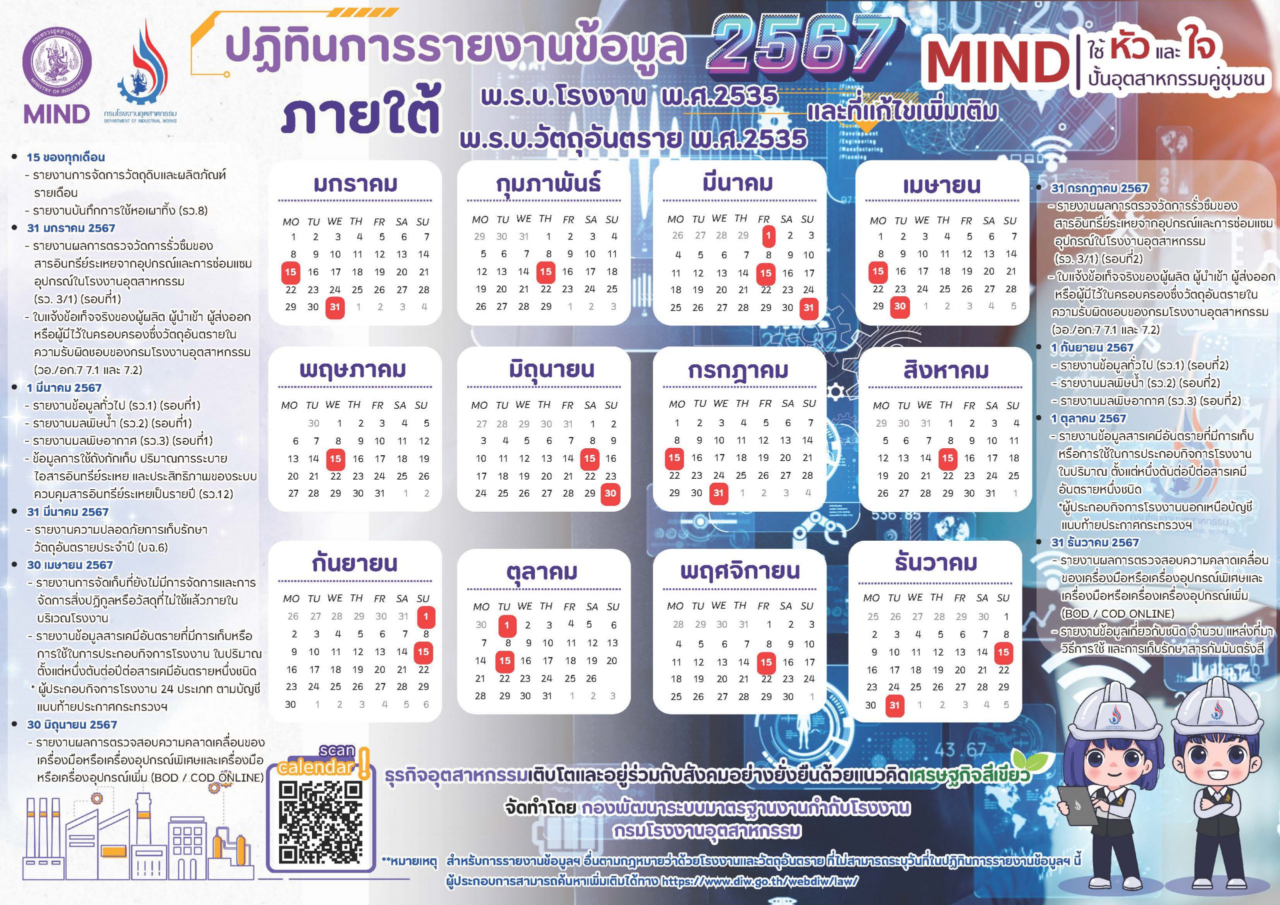 กองพัฒนาระบบมาตรฐานงานกำกับโรงงาน กรมโรงงานอุตสาหกรรม จัดทำปฏิทินการรายงานข้อมูลประจำปี พ.ศ. 2567 ภายใต้พระราชบัญญัติโรงงาน พ.ศ. 2535 และที่แก้ไขเพิ่มเติม และพระราชบัญญัติวัตถุอันตราย พ.ศ. 2535 และที่แก้ไขเพิ่มเติม เพื่อให้ผู้ประกอบกิจการไม่พลาดการรายงานข้อมูลที่เกี่ยวข้องประจำรอบปีปฏิทิน โดยผู้ประกอบกิจการสามารถเข้าดูรายละเอียดเพิ่มเติมได้ที่ https://heyzine.com/flip-book/28082ec041.html