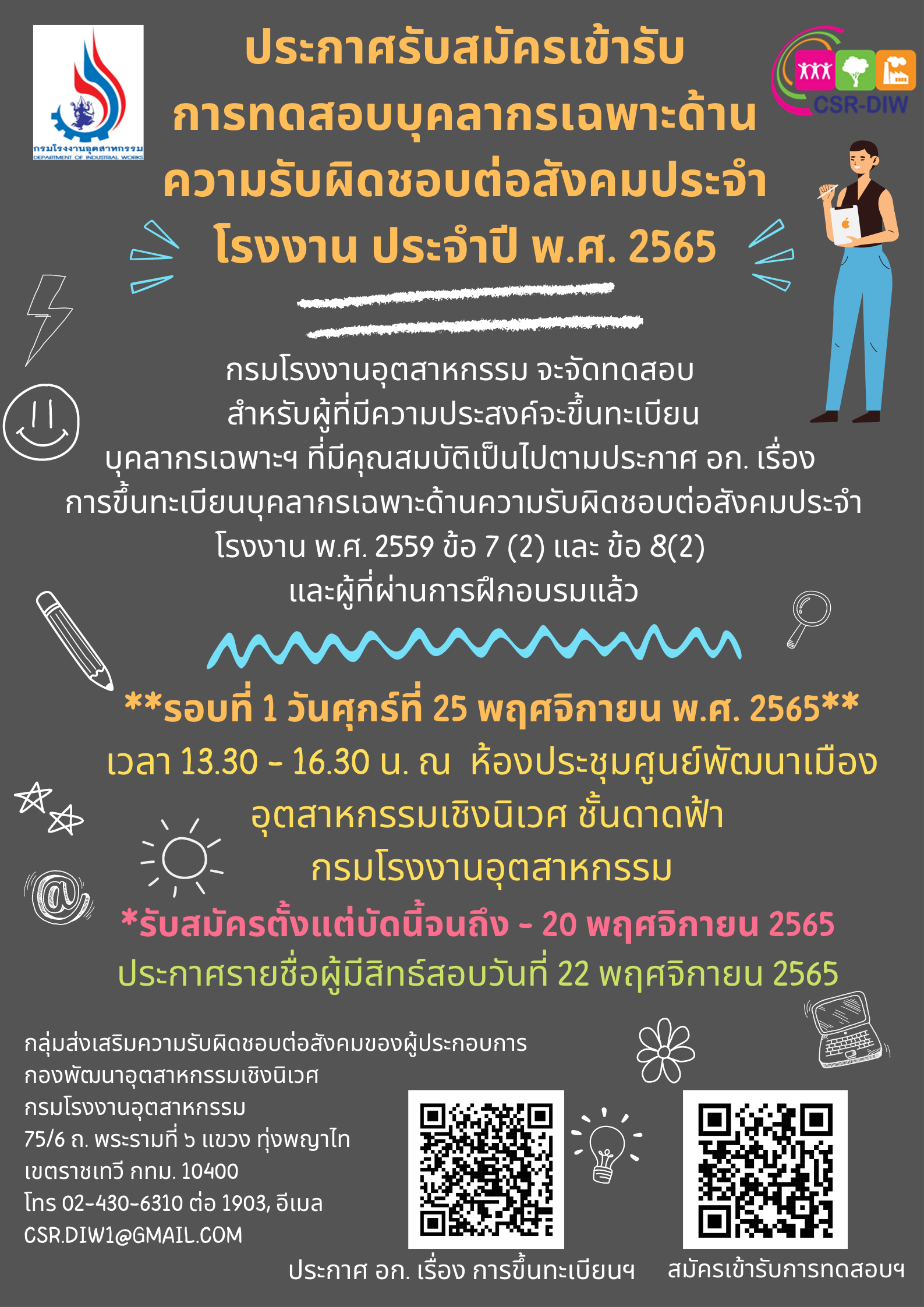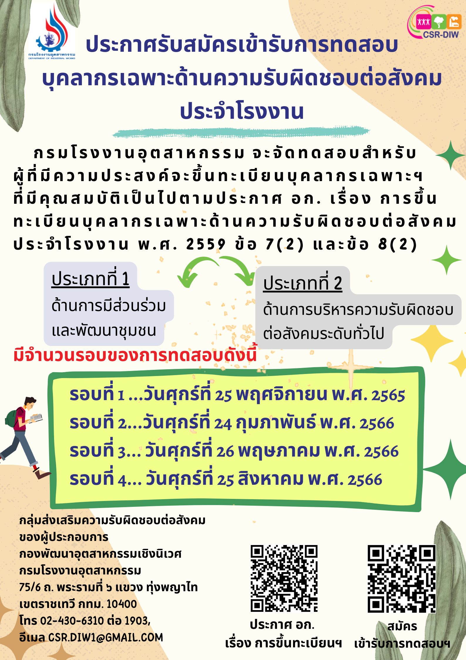 ประชาสัมพันธ์ ประกาศรับสมัครเข้ารับการทดสอบบุคลากรเฉพาะด้านความรับผิดชอบต่อสังคมประจำโรงงาน