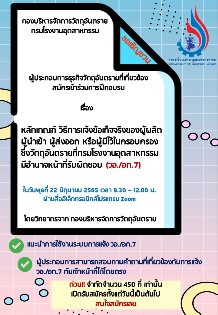 กำหนดการ คลิก Facebook iconFacebookTwitter iconTwitterLINE iconLine Read more articles Previous Postเชิญเข้าร่วม โครงการฝึกอบรม เรื่อง ความรู้ความเข้าใจเกี่ยวกับพระราชบัญญัติโรงงาน พ.ศ. 2535 และที่แก้ไขเพิ่มเติมและอนุบัญญัติต่างๆ (สำหรับผู้ประกอบกิจการผดรงงาน) ประจำปีงบประมาณ พ.ศ. 2565 Next Postขอเชิญเข้าร่วมฝึกอบรมออนไลน์ “แลกเปลี่ยนองค์ความรู้และสร้างเครือข่ายด้านเศรษฐกิจหมุนเวียน” รุ่นที่ 2 สำหรับผู้ประกอบการ