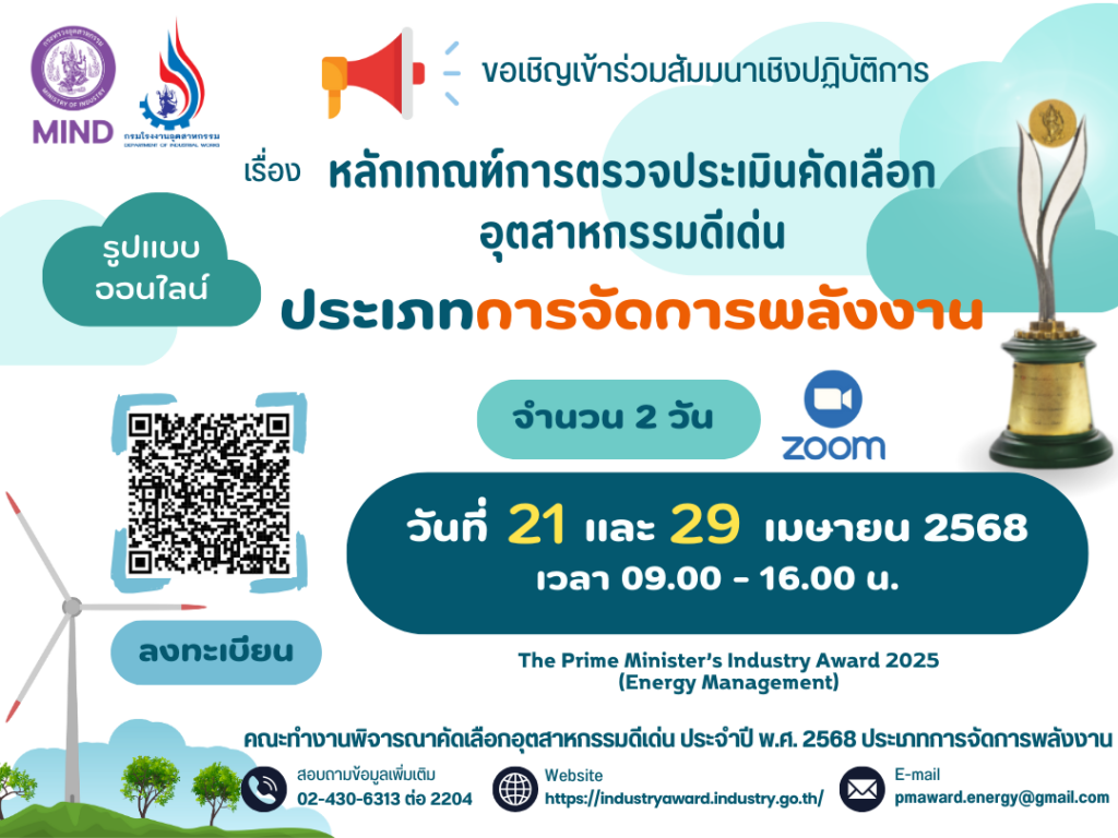 ขอเชิญเข้าร่วมสัมมนาเชิงปฏิบัติการ หลักเกณฑ์การตรวจประเมินคัดเลือกอุตสาหกรรมดีเด่น ประจำปี พ.ศ.2568