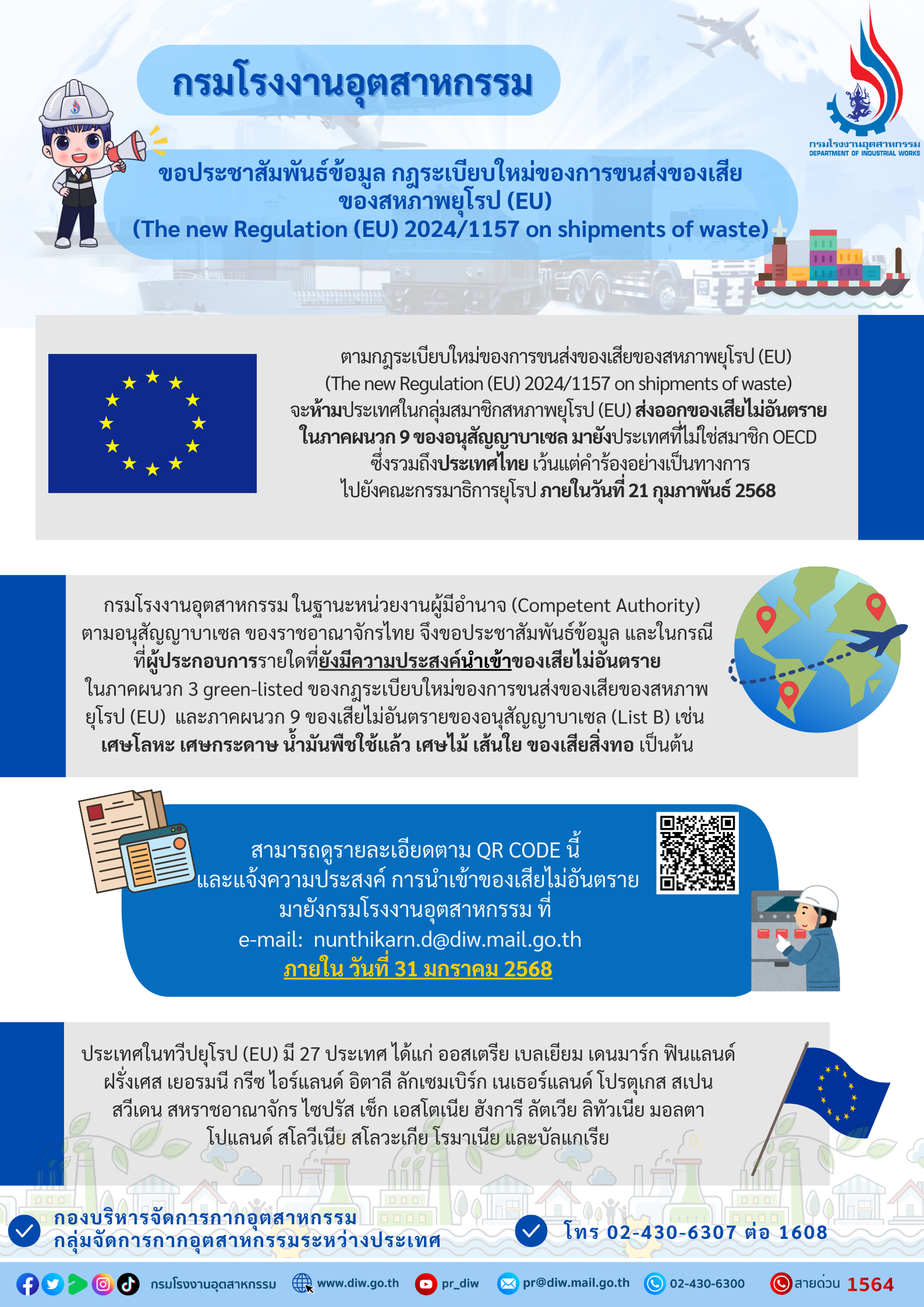 Facebook iconFacebookTwitter iconTwitterLINE iconLine Read more articles Previous Postเตือนให้ดำเนินการตามประกาศกระทรวงอุตสาหรรม เรื่อง มาตรการความปลอดภัยเกี่ยวกับการจัดการสารเคมีในโรงงานอุตสาหกรรม (ฉบับที่ 2) พ.ศ.2566 Next Postการช่วยเหลือผู้ประกอบการกิจการโรงงานซึ่งได้รับความเสียหายจากภัยธรรมชาติน้ำท่วม พ.ศ. 2567 (ฉบับที่ 2)