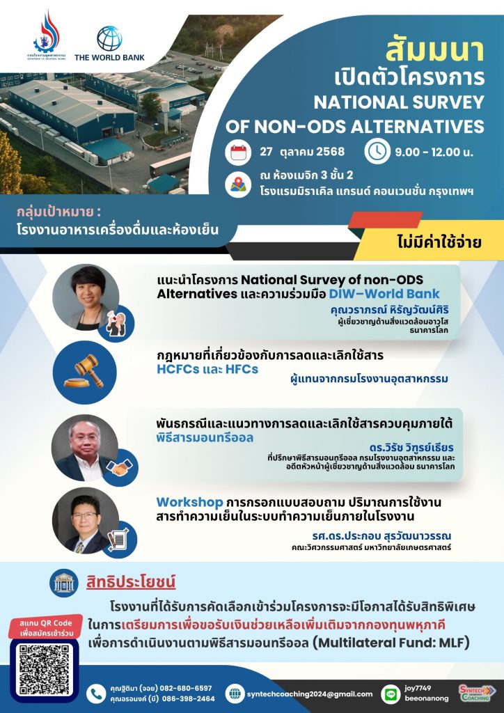 ขอเชิญเข้าร่วมงานสัมมนาเปิดตัวโครงการ National Survey of non-ODS Alternatives ในวันจันทร์ที่ 27 ตุลาคม 2568 เวลา 09.00 – 12.00 น. ณ โรงแรมมิราเคิล แกรนด์ คอนเวนชั่น กรุงเทพมหานคร