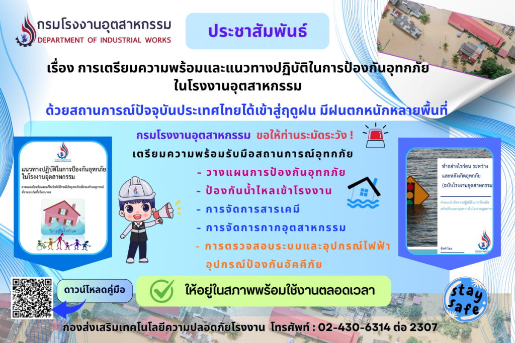อ่านคู่มือ คู่มือแนวทางปฏิบัติในการป้องกันอุทกภัยในโรงงานอุตสาหกรรม ได้ที่นี่ >> คลิกที่นี่ <<