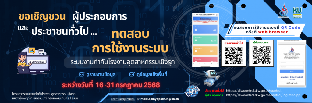 ขอเชิญชวนผู้ประกอบกิจการโรงงานและประชาชนทั่วไปเข้าทดสอบระบบงานกำกับโรงงานอุตสาหกรรมเชิงรุก ระหว่างวันที่ 16 – 31 กรกฎาคม 2568
