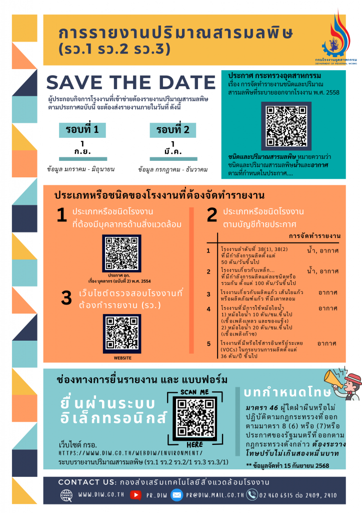 อย่าลืมรายงานข้อมูลปริมาณสารมลพิษที่ระบายออกจากโรงงานตามกฎหมายว่าด้วยโรงงาน (รว.1, รว.2 และ รว..3) เพื่อให้ไม่พลาดการยื่นรายงานข้อมูลปริมาณสารมลพิษน้ำและอากาศ ตามประกาศกระทรวงอุตสาหกรรม เรื่อง การจัดทำรายงานชนิดและปริมาณสารมลพิษที่ระบายออกจากโรงงาน พ.ศ. 2558