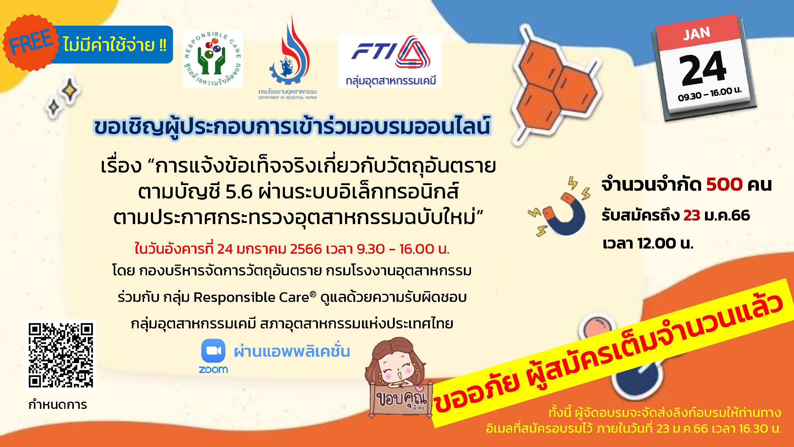ขอเชิญเข้าร่วมอบรม เรื่อง “การแจ้งข้อเท็จจริงเกี่ยวกับวัตถุอันตรายตามบัญชี 5.6 ผ่านระบบอิเล็กทรอนิกส์ ตามประกาศกระทรวงอุตสาหกรรมฉบับใหม่” (ปิดรับสมัครแล้ว)