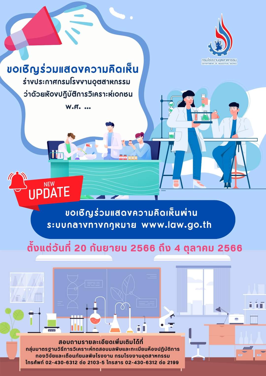 ขอเชิญร่วมแสดงความคิดเห็น ร่าง ประกาศกรมโรงงานอุตสาหกรรม ว่าด้วยห้องปฏิบัติการวิเคราะห์เอกชน พ.ศ. …. (สิ้นสุดรับฟังความคิดเห็น วันที่ 4 ต.ค. 2566)