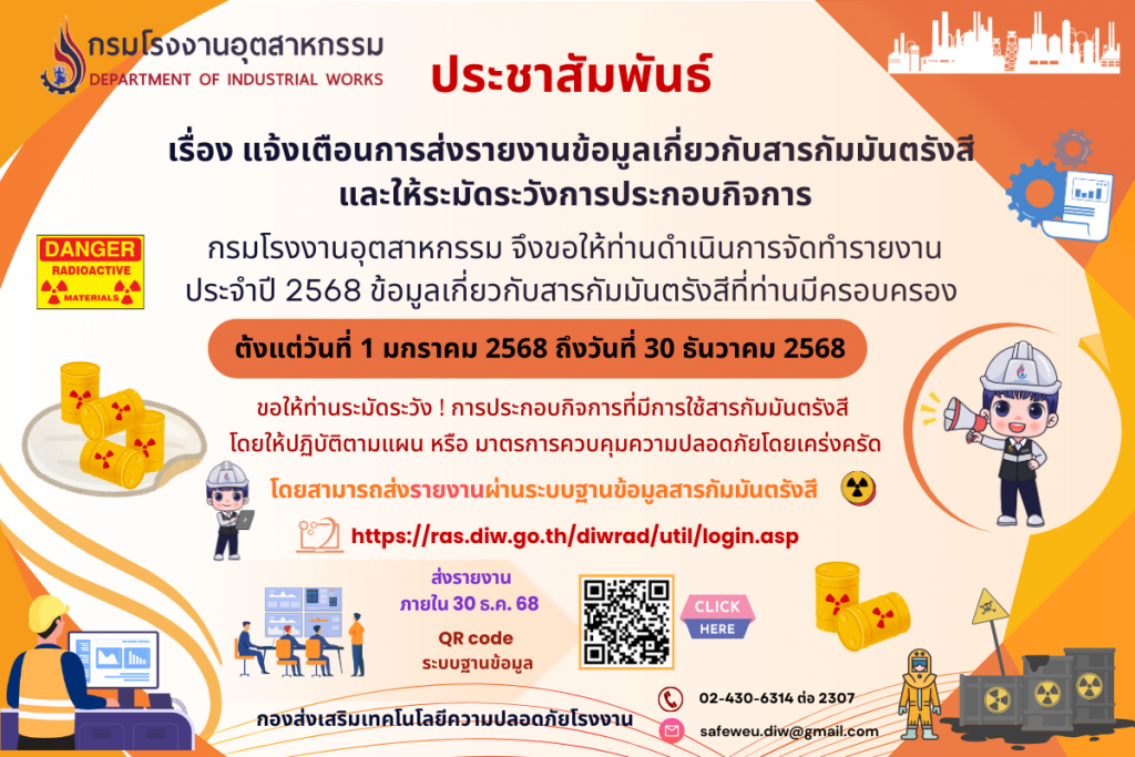 อ่านรายละเอียดหนังสือ เรื่อง แจ้งเตือนการส่งรายงานข้อมูลเกี่ยวกับสารกัมมันตรังสีและให้ระมัดระวังการประกอบกิจการ >> คลิกที่นี่ <<