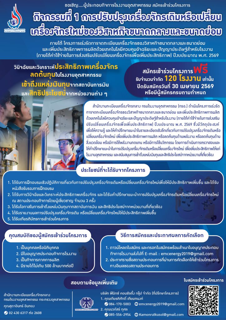 ขอเชิญผู้ประกอบกิจการโรงงานอุตสาหกรรม สมัครเข้าร่วมโครงการการปรับปรุงเครื่องจักรเดิมหรือเปลี่ยนเครื่องจักรใหม่ของวิสาหกิจขนาดกลางและขนาดย่อม