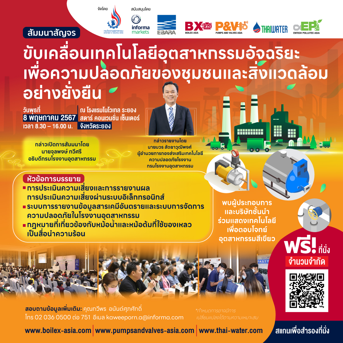 ขอเชิญเข้าร่วมงานสัมมนาสัญจร (RoadShow) ภายใต้หัวข้อ “ขับเคลื่อนเทคโนโลยีอุตสาหกรรมอัจฉริยะเพื่อความปลอดภัยของชุมชนและสิ่งแวดล้อมอย่างยั่งยืน” ในวันพุธที่ 8 พฤษภาคม 2567 เวลา 08.30 – 16.00 น. ณ โรงแรมโนโวเทล ระยอง สตาร์ คอนเวนชั่น เซ็นเตอร์ จังหวัดระยอง โดยสามารถดูรายละเอียดได้ คลิก Download