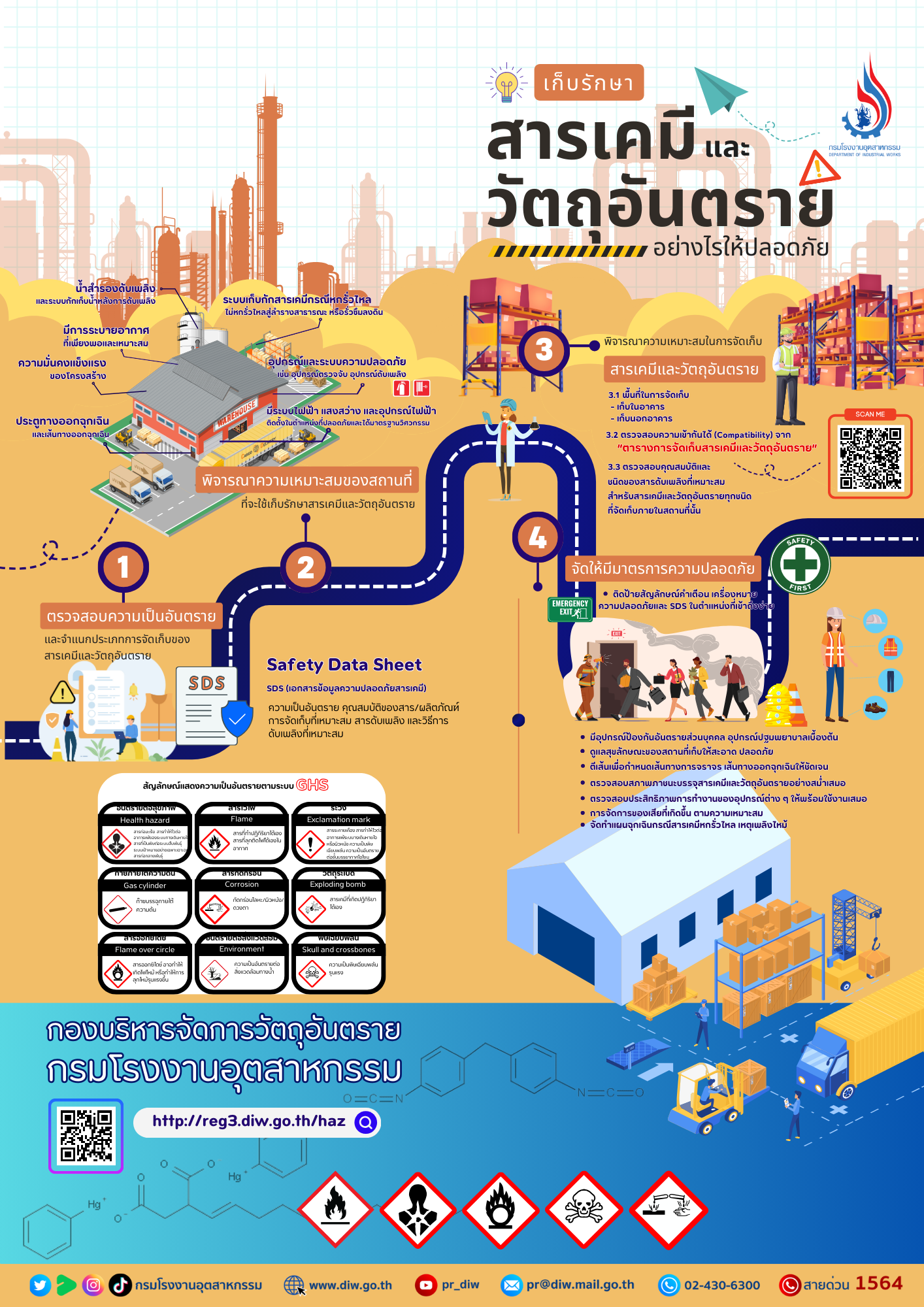 กองบริหารจัดการวัตถุอันตราย กรมโรงงานอุตสาหกรรม จัดทำสื่อเกี่ยวกับ การเก็บรักษาสารเคมีและวัตถุอันตรายอย่างไรให้ปลอดภัย โดยผู้ประกอบกิจการสามารถสอบถามรายละเอียดเพิ่มเติมได้ที่ http://reg3.diw.go.th/haz/