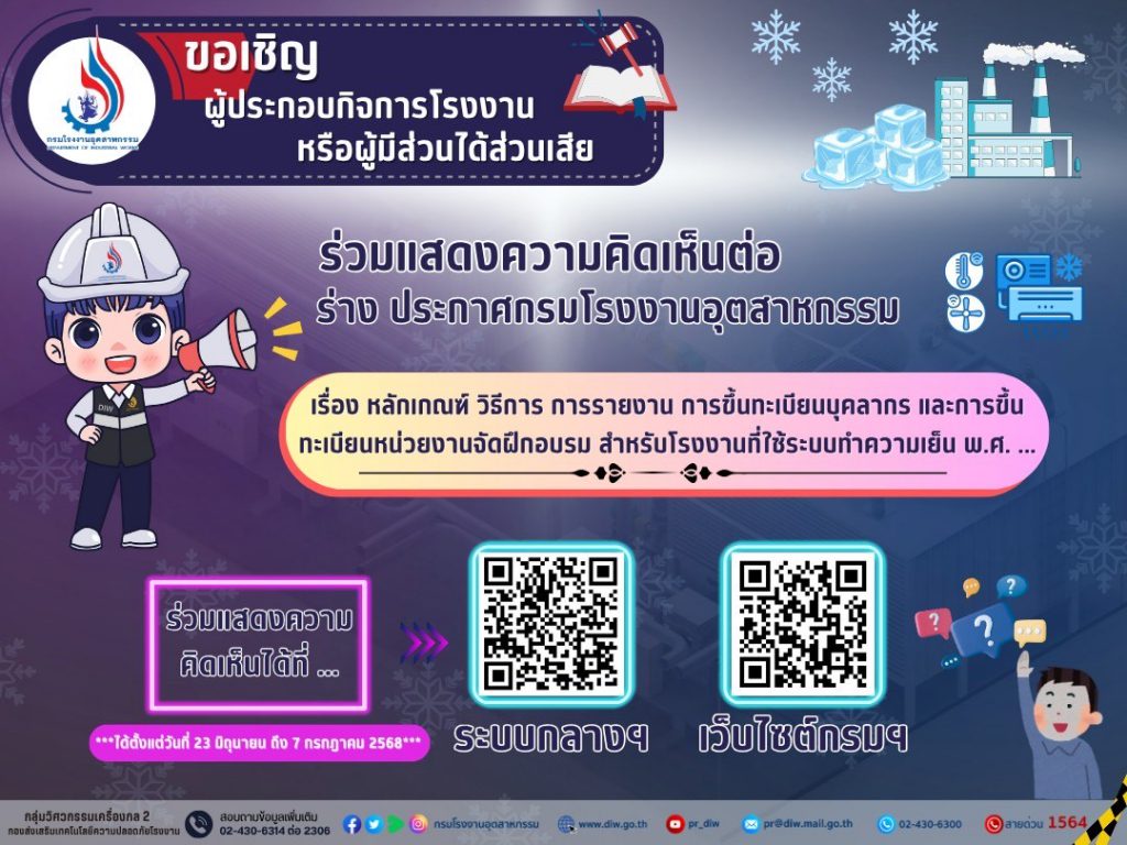 ขอเชิญผู้ประกอบกิจการโรงงานหรือผู้มีส่วนได้ส่วนเสีย ร่วมแสดงความคิดเห็นต่อร่าง ประกาศกรมโรงงานอุตสาหกรรม