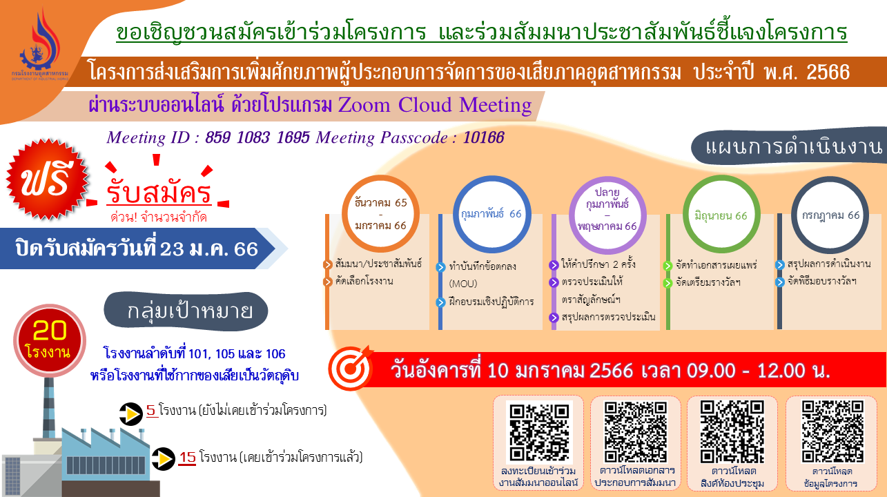 ขอเชิญชวนสมัครเข้าร่วมโครงการ และร่วมสัมมนาประชาสัมพันธ์ชี้แจงโครงการส่งเสริมการเพิ่มศักยภาพผู้ประกอบการจัดการของเสียภาคอุตสาหกรรม ประจำปีงบประมาณ พ.ศ. 2566