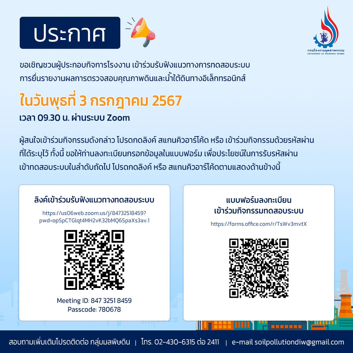 ขอเชิญผู้ประกอบกิจการเข้าร่วมรับฟังแนวทางการทดสอบระบบการยื่นรายงานผลการตรวจสอบคุณภาพดินและน้ำใต้ดินทางอิเล็กทรอนิกส์ วันพุธที่ 3 กรกฎาคม 2567 เวลา 09.30 น. ผ่านระบบ Zoom