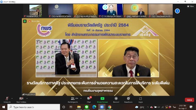 วันพฤหัสบดีที่ 16 กันยายน 2564 เวลา 13.30 น. นายประกอบ วิวิธจินดา อธิบดีกรมโรงงานอุตสาหกรรม รับมอบรางวัล เลิศรัฐ ประเภทยกระดับการอำนวยความสะดวกในการให้บริการ ระดับดีเด่น ประจำปี 2564 ผ่านระบบสื่ออิเล็กทรอนิกส์ โดยมีนายวิษณุ เครืองาม รองนายกรัฐมนตรี เป็นประธาน พร้อมด้วยนายวีระกิตติ์ รันทกิจธนวัชร์ นายศุภกิจ บุญศิริ นายสหวัฒน์ โสภา รองอธิบดีกรมโรงงานอุตสาหกรรม ผู้บริหารและเจ้าหน้าที่ที่เกี่ยวข้องเข้าร่วมแสดงความยินดี ณ ห้องศูนย์พัฒนาเมืองอุตสาหกรรมเชิงนิเวศ ชั้นดาดฟ้า อาคารกรมโรงงานอุตสาหกรรม
