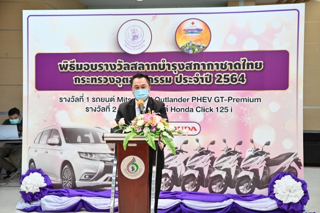วันพุธที่ 2 กุมภาพันธ์ 2565 เวลา 09.30 น. นายวันชัย พนมชัย อธิบดีกรมโรงงานอุตสาหกรรม เข้าร่วมพิธีมอบรางวัลบำรุงสภากาชาดไทยกระทรวงอุตสาหกรรม ประจำปี 2564 ให้แก่ผู้โชคดี โดยรางวัลที่ 1 เป็นรถยนต์ยี่ห้อ Mitsubishi Outlander PHEV รุ่น GT-Premium รางวัลที่ 2 รถจักรยานยนต์ ยี่ห้อ Honda รุ่ง Honda Click 125i จำนวน 4 รางวัล โดยมีนายกอบชัย สังสิทธิสวัสดิ์ ปลัดกระทรวงอุตสาหกรรม เป็นประธาน พร้อมด้วยผู้บริหารและเจ้าหน้าที่ที่เกี่ยวข้องเข้าร่วมแสดงความยินดี ณ บริเวณห้องโถง ชั้น 1 อาคารสำนักงานปลัดกระทรวงอุตสาหกรรม