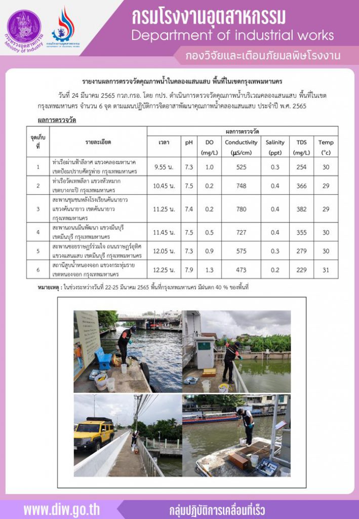 วันที่ 24 มีนาคม 2565 กรมโรงงานอุตสาหกรรม โดยกองวิจัยและเตือนภัยมลพิษโรงงาน ดำเนินการตรวจวัดคุณภาพน้ำบริเวณคลองแสนแสบ พื้นที่ในเขตกรุงเทพมหานคร จำนวน 6 จุด ตามแผนปฏิบัติการจิตอาสาพัฒนาคุณภาพน้ำคลองแสนแสบ ประจำปี พ.ศ. 2565