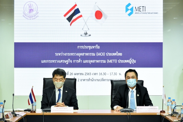 วันอังคารที่ 26 เมษายน 2565 เวลา 16.30 น. นายวันชัย พนมชัย อธิบดีกรมโรงงานอุตสาหกรรม เข้าร่วมประชุมหารือกับ นายฮิโรเสะ นาโอชิ ผู้ช่วยรัฐมนตรีกระทรวงเศรษฐกิจ การค้า และอุตสาหกรรม (METI) ประเทศญี่ปุ่น (Mr. HIROSE Naoshi, Vice-Minister for International Affair METI) และคณะ เพื่อสานต่อข้อริเริ่มการเป็นหุ้นส่วนการร่วมสร้างสรรค์ (Co-Creation) ระหว่างไทย-ญี่ปุ่น พร้อมหารือแนวทางข้อเสนอการลงทุนเอเชีย-ญี่ปุ่น เพื่ออนาคต (Asia-Japan Investing for the Future: AJIF) การสร้างห่วงโซ่อุปทานร่วมกัน การพัฒนาทรัพยากรมนุษย์ รวมถึงการพัฒนา SMEs และ Startups โดยมีนายกอบชัย สังสิทธิสวัสดิ์ ปลัดกระทรวงอุตสาหกรรม พร้อมด้วยนายภานุวัฒน์ ตริยางกูรศรี รองปลัดกระทรวงอุตสาหกรรม และผู้บริหารระดับสูงของกระทรวงอุตสาหกรรม ร่วมประชุม ณ ห้องประชุม อก. 1 ชั้น 2 สำนักงานปลัดกระทรวงอุตสาหกรรม