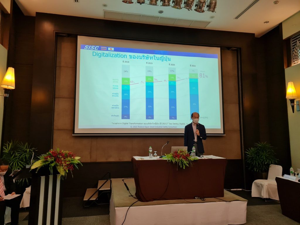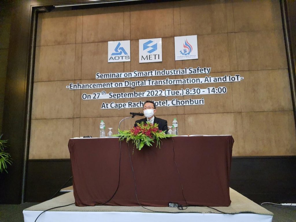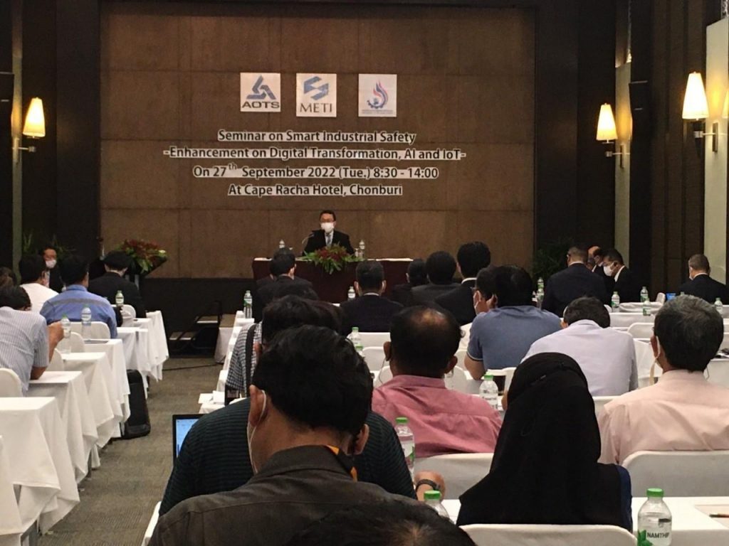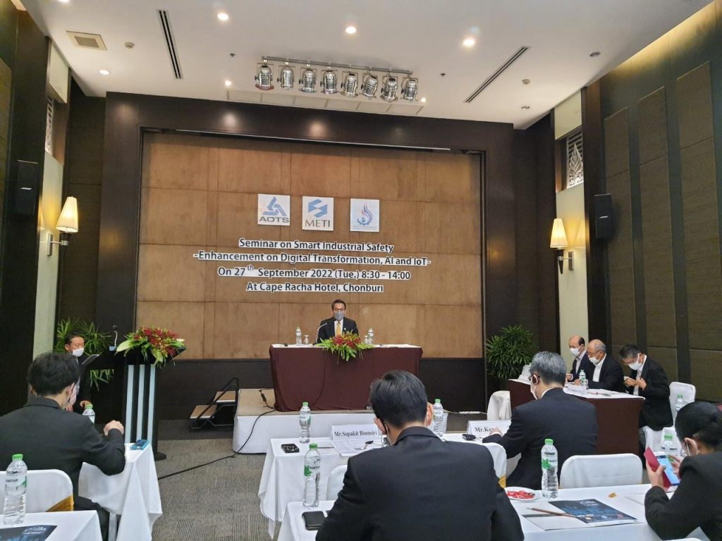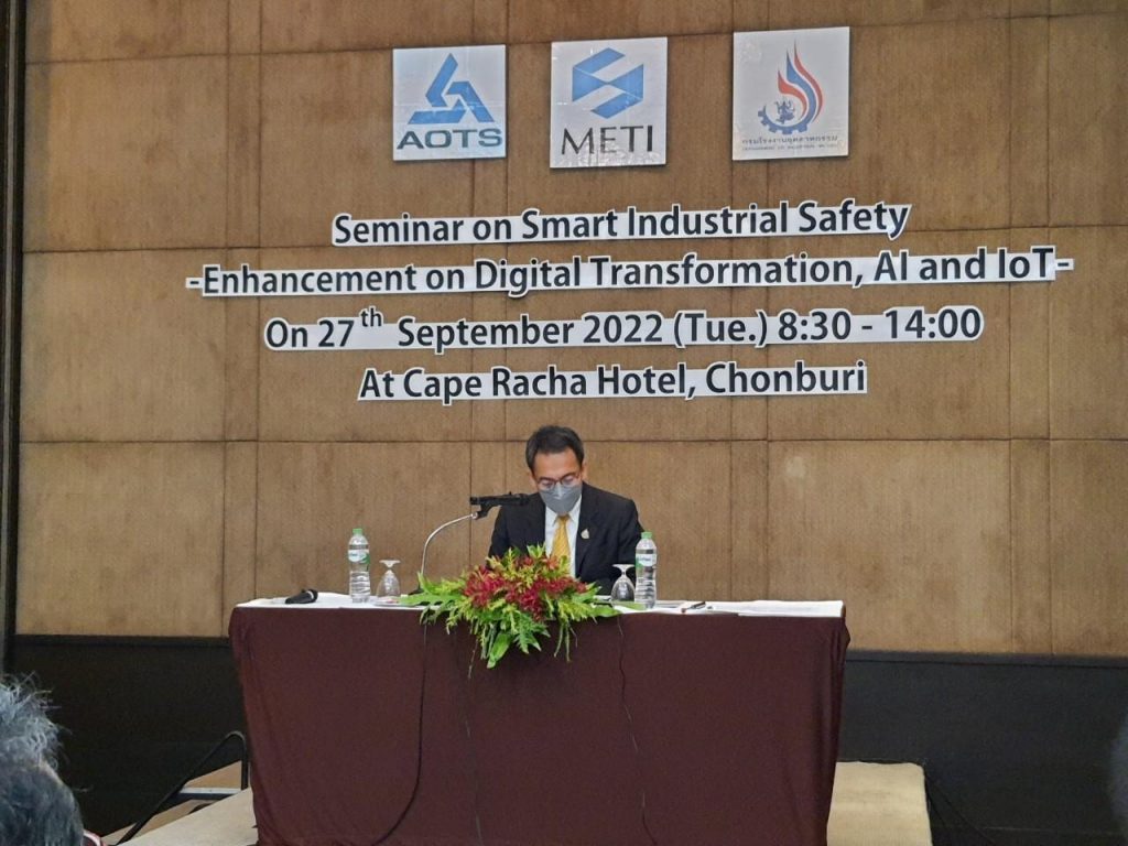 วันอังคารที่ 27 กันยายน 2565 เวลา 09.00 นายศุภกิจ บุญศิริ รองอธิบดีกรมโรงงานอุตสหกรรม เป็นประธานเปิดงานสัมมนา “Smart Industrial Safety (Digitalization, AI/IoTs)” ภายใต้ความร่วมมือระหว่างกรมโรงงานอุตสาหกรรม กับ กระทรวงเศรษฐกิจ การค้าและอุตสาหกรรม (Ministry of Economy Trade and Industry : METI) เพื่อแลกเปลี่ยนเรียนรู้เกี่ยวกับการเปลี่ยนแปลงทางเศรษฐกิจและสังคม เพื่อผลักดันด้านความปลอดภัยอุตสาหกรรมอัจฉริยะ