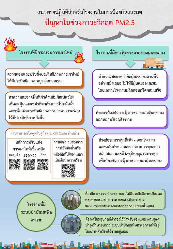 นายจุลพงษ์ ทวีศรี อธิบดีกรมโรงงานอุตสาหกรรม กล่าวว่า ได้สั่งการให้หน่วยงานใน กรอ. ดำเนินการตามนโยบายรัฐมนตรีว่าการกระทรวงอุตสาหกรรม โดยให้ดำเนินการตรวจกำกับโรงงานอย่างเข้มงวด เพื่อเป็นการป้องกันปัญหาฝุ่นละอองขนาดเล็ก (PM2.5) จากการประกอบกิจการโรงงาน นอกจากนี้เมื่อกลางปี กรอ. ได้ออกกฎหมายให้โรงงานต้องติดตั้งเครื่องมือหรือเครื่องอุปกรณ์พิเศษ (CEMS) เพื่อติดตามข้อมูลการระบายมลพิษอากาศจากปล่องโรงงานอุตสาหกรรม และให้โรงงานส่งข้อมูลเข้าสู่ระบบเฝ้าระวังและเตือนภัยมลพิษระยะไกลแสดงผลบนเว็บไซต์ของ กรอ. https://poms.diw.go.th และ แอปพลิเคชัน POMS (Pollution Online Monitoring System) ประชาชนสามารถติดตามการระบายมลพิษอากาศของโรงงานได้ตลอดเวลา โดยสามารถดาวน์โหลดแอปพลิเคชันได้ทั้งระบบ Android และ iOS