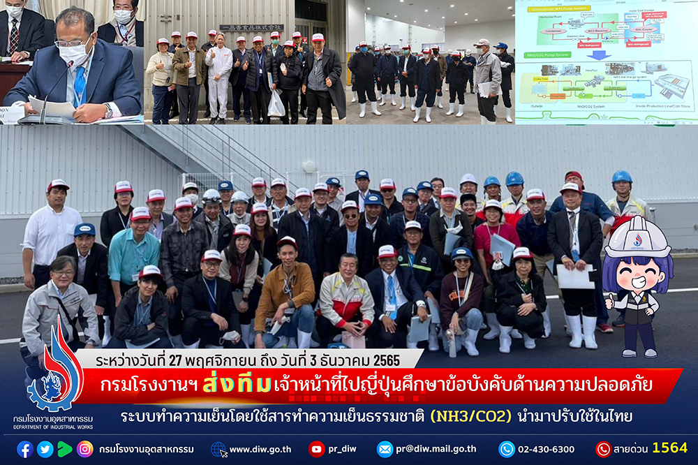 กรมโรงงานฯ ส่งทีมเจ้าหน้าที่เข้าศึกษาการนำข้อบังคับด้านความปลอดภัย ที่รัฐบาลประเทศญี่ปุ่นส่งเสริมให้ผู้ประกอบการเร่งการใช้อุปกรณ์ที่ใช้สารทำความเย็นธรรมชาติ (NH3/CO2) แบบประหยัดพลังงานเพื่อสร้างสังคมคาร์บอนต่ำและไร้สารฟลูออโรคาร์บอน พร้อมศึกษาดูงานในโรงงานทำความเย็นและทำน้ำแข็งในประเทศญี่ปุ่น เพื่อนำมาปรับใช้ในระบบทำความเย็นของประเทศไทย
