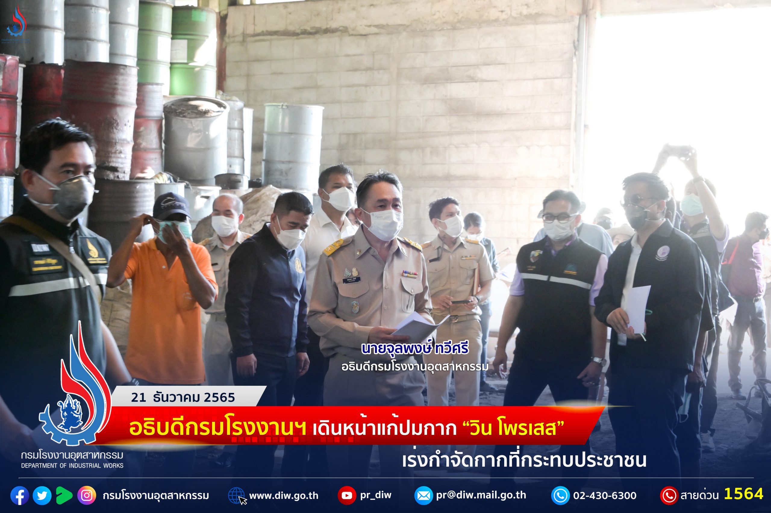 วันที่ 21 ธันวาคม 2565 นายจุลพงษ์ ทวีศรี อธิบดีกรมโรงงานอุตสาหกรรม นำ นางจินดา เตชะศรินทร์ ผู้อำนวยการกองบริหารจัดการกากอุตสาหกรรม นายทวี อำพาพันธ์ ผู้อำนวยการศูนย์วิจัยและเตือนภัยมลพิษโรงงานภาคตะวันออก สำนักงานอุตสาหกรรมจังหวัดระยอง สำนักงานสิ่งแวดล้อมและควบคุมมลพิษที่ 13 (ชลบุรี) องค์การบริหารส่วนตำบลบางบุตร บริษัท บริหารสินทรัพย์ ธนาคารอิสลามแห่งประเทศไทย จำกัด ผู้แทน บริษัท วิน โพรเสส จำกัด และชาวบ้านหนองพะวา ผู้ได้รับผลกระทบจากปัญหากลิ่นเหม็นและน้ำเน่าเสีย ลงพื้นที่โรงงาน บริษัท วิน โพรเสส จำกัด อำเภอบ้านค่าย จังหวัดระยอง เพื่อร่วมตรวจนับและติดตามการดำเนินการกำจัดบำบัดกากของเสียที่คงเหลืออยู่ภายในโรงงาน ตามคำพิพากษาของศาลจังหวัดระยอง เมื่อวันที่ 25 มีนาคม 2564 โดยมีของเสียตามคำพิพากษาที่ต้องกำจัดบำบัด ได้แก่ เศษฝุ่นเหล็กและตะกรัน 4,000 ตัน ของเหลวและกากตะกอนในบ่อคอนกรีต 800 ตัน ของเสียเคมีวัตถุประเภทของเหลวไม่ทราบชนิดบรรจุภายในภาชนะ ภาชนะปนเปื้อนถังขนาด 200 ลิตร ถังขนาด 1,000 ลิตร น้ำในบ่อดินและพื้นที่ปนเปื้อน 14,000 ตัน รวมทั้งขยะทั่วไป อาทิ พรม ยาง ถังพลาสติก ซึ่งโรงงานต้องบำบัดกำจัดให้แล้วเสร็จภายในเดือนมีนาคม 2566