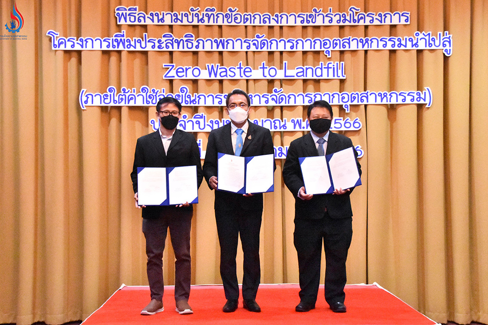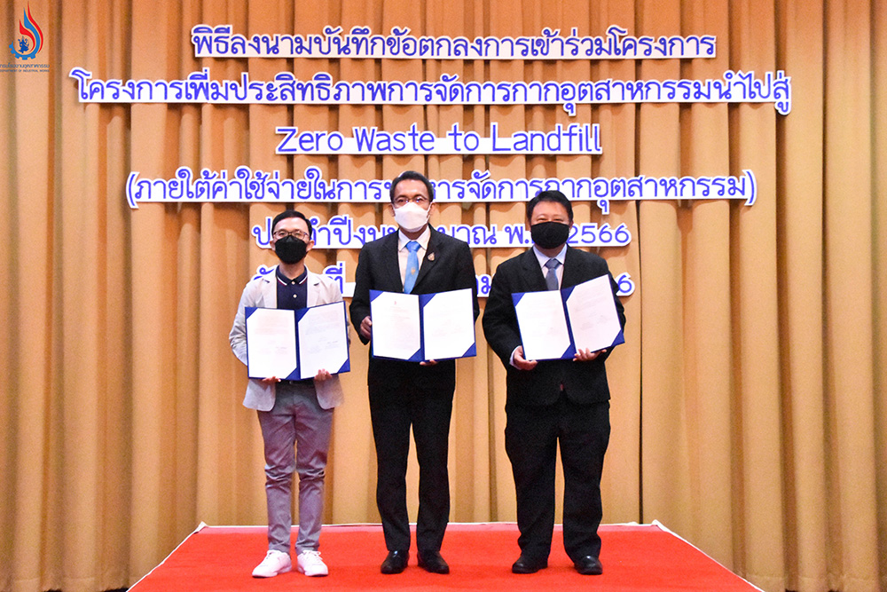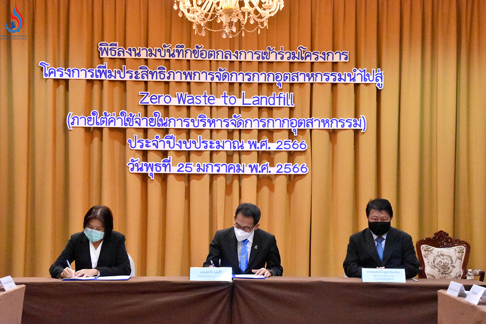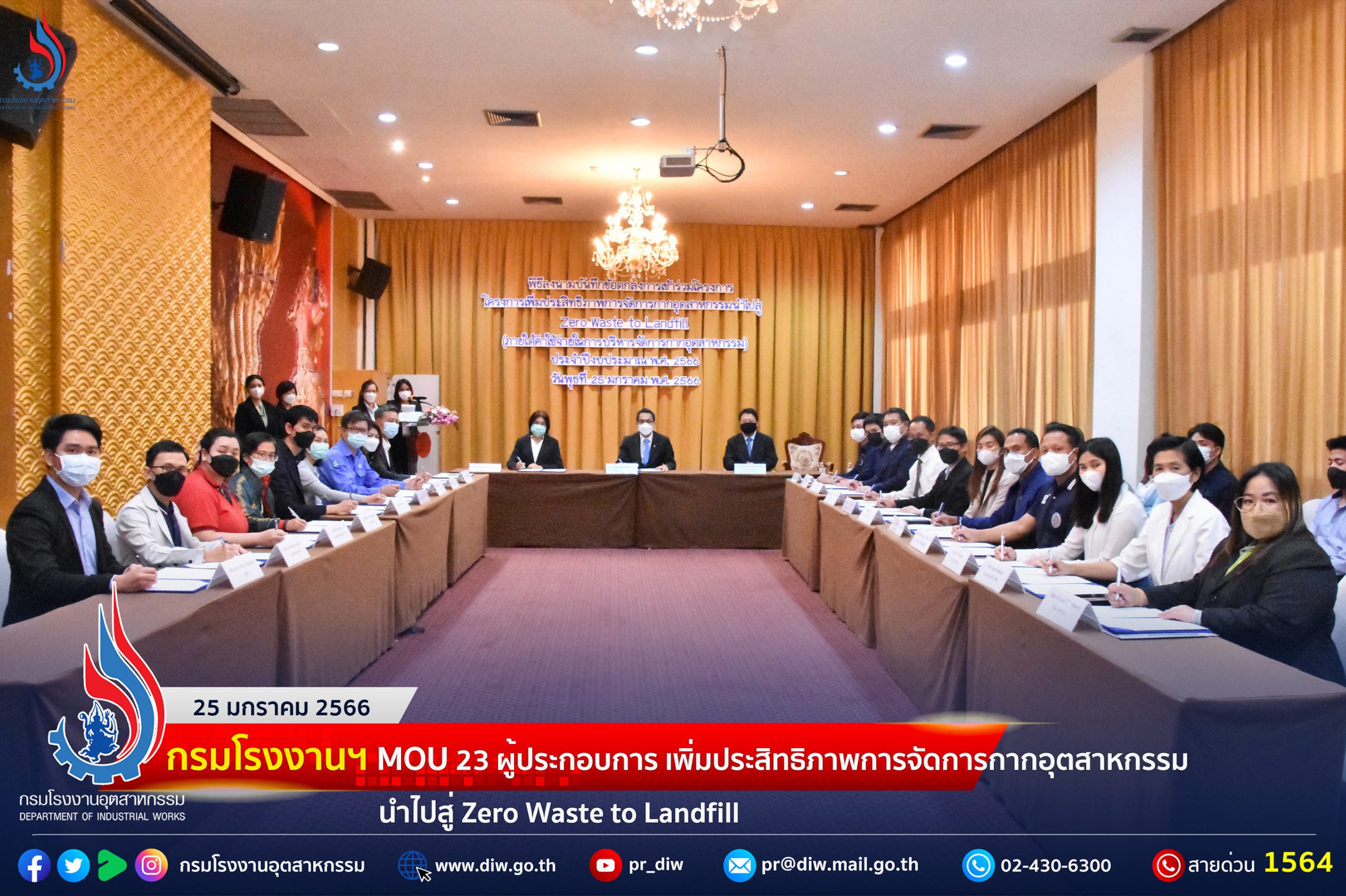 วันที่ 25 มกราคม 2566 นายจุลพงษ์ ทวีศรี อธิบดีกรมโรงงานอุตสาหกรรม มอบหมายให้ นายศุภกิจ บุญศิริ รองอธิบดีกรมโรงงานอุตสาหกรรม เป็นประธานพิธีลงนามบันทึกข้อตกลงในการเข้าร่วมโครงการ (MOU) โครงการเพิ่มประสิทธิภาพการจัดการกากอุตสาหกรรมนำไปสู่ Zero Waste to Landfill ประจำปีงบประมาณ พ.ศ. 2566 โดยมีผู้ประกอบการได้รับการคัดเลือกให้เข้าร่วมลงนามจำนวน 23 โรงงาน ณ ห้องวีไอพี 1 สโมสรทหารบก (วิภาวดี) กรุงเทพฯ