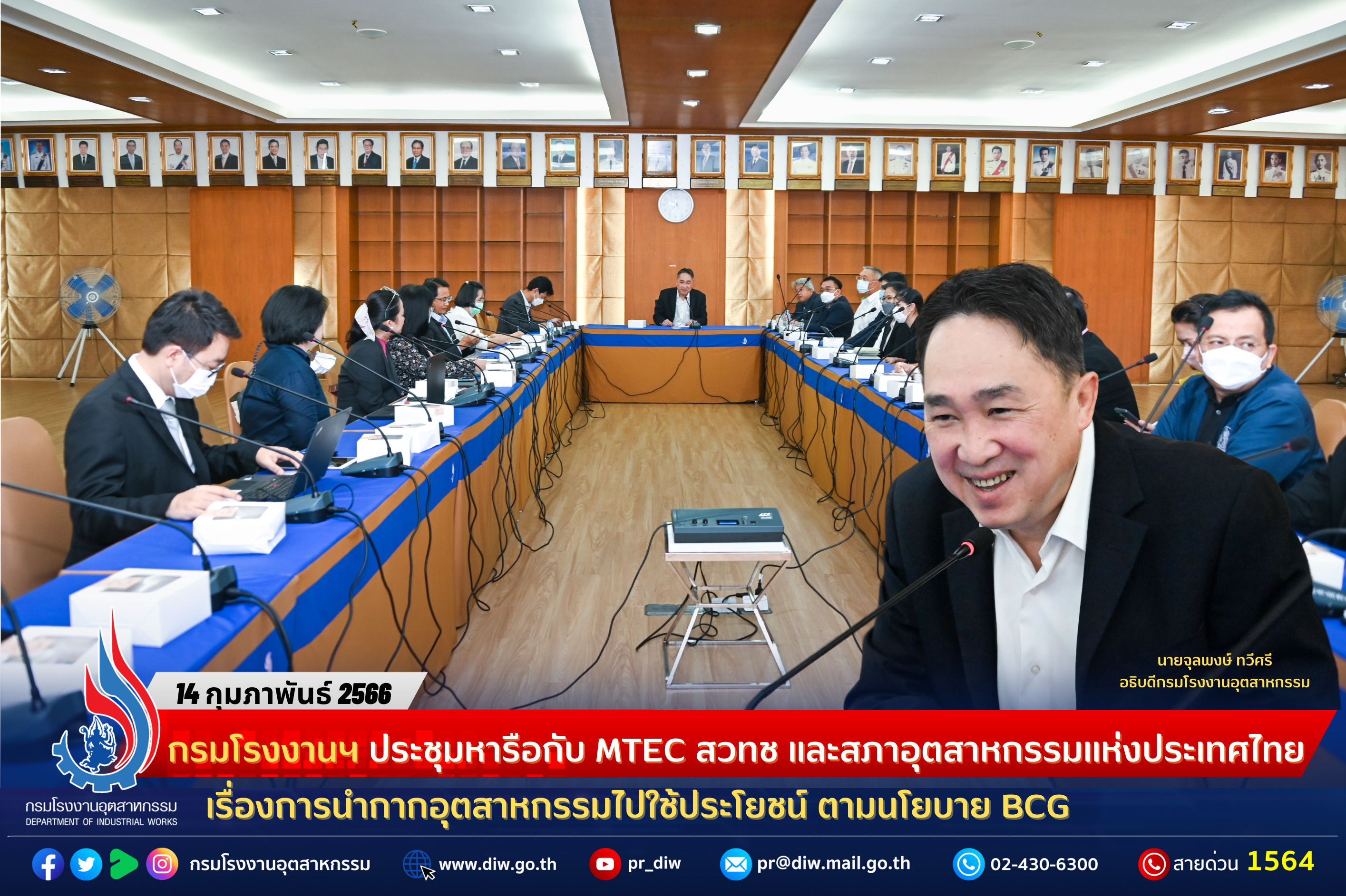 วันที่ 14 กุมภาพันธ์ 2566 นายจุลพงษ์ ทวีศรี อธิบดีกรมโรงงานอุตสาหกรรม ประชุมหารือกับ นายจุลเทพ ขจรไชยกูล ผู้อำนวยการศูนย์เทคโนโลยีโลหะและวัสดุแห่งชาติ สวทช นายธีระพล ติรวศิน ประธานกลุ่มอุตสาหกรรมการจัดการเพื่อสิ่งแวดล้อม สภาอุตสาหกรรมแห่งประเทศไทย และ นายพร้อมพร อิศรางกูร ณ อยุธยา ผู้แทนสถาบันน้ำและสิ่งแวดล้อมเพื่อความยั่งยืน สภาอุตสาหกรรมแห่งประเทศไทย พร้อมด้วย เจ้าหน้าที่กรมโรงงานอุตสาหกรรม คณะนักวิจัยจากศูนย์เทคโนโลยีโลหะและวัสดุแห่งชาติ และคณะกรรมการกลุ่มอุตสาหกรรมการจัดการเพื่อสิ่งแวดล้อม สภาอุตสาหกรรมแห่งประเทศไทย เพื่อหาแนวทางการนำเทคโนโลยีและนวัตกรรมมาเพิ่มมูลค่าและนำกากอุตสาหกรรมไปใช้ประโยชน์เป็นวัสดุหมุนเวียน (Circular Materials) ตามกรอบแนวคิดการสิ้นสุดการเป็นของเสีย (End-of-Waste) ซึ่งจะนำไปสู่การพัฒนาความร่วมมือเพื่อให้เกิดผลิตภัณฑ์ที่ได้จากการนำกากอุตสาหกรรมไปใช้ประโยชน์ ตามนโยบาย BCG ของกระทรวงอุตสาหกรรม ในด้านระบบเศรษฐกิจหมุนเวียน (Circular Economy) มุ่งเน้นการหมุนเวียนใช้ทรัพยากรให้เกิดประโยชน์สูงสุด ลดการใช้ทรัพยากรที่มีจำกัด และลดของเสีย ต่อไป ณ ห้องประชุม 509 ชั้น 5 อาคารกรมโรงงานอุตสาหกรรม