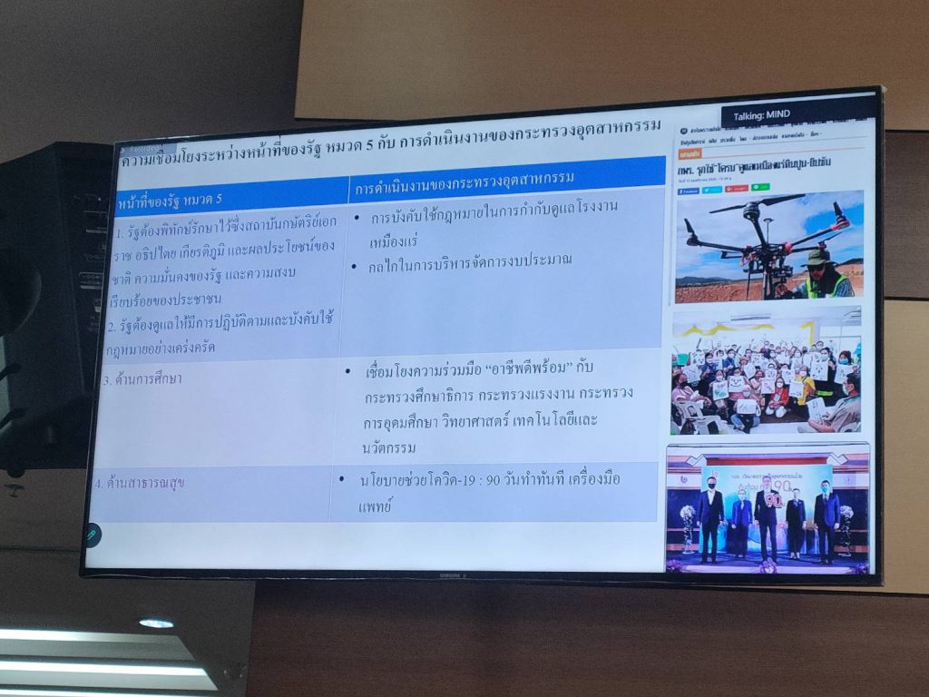 ปลัดกระทรวงอุตสาหกรรม ได้นำเสนอการดำเนินงานของกระทรวงอุตสาหกรรมที่เชื่อมโยงตามรัฐธรรมนูญ หมวด 5 หน้าที่ของรัฐแห่งรัฐธรรมนูญแห่งราชอาณาจักรไทย พุทธศักราช 2560 ทั้ง 13 ด้าน บนพื้นฐานของนโยบาย “MIND” ใช้ “หัว” และ “ใจ” ปั้นอุตสาหกรรมคู่ชุมชน เช่น การบังคับใช้กฎหมายในการกำกับดูแลโรงงานเหมืองแร่ กลไกในการบริหารจัดการงบประมาณ เชื่อมโยงความร่วมมือ “อาชีพดีพร้อม” กับกระทรวงต่าง ๆ นโยบายช่วยโควิด-19 : 90 วันทำทันที การสนับสนุนผู้ประกอบการเครื่องมือแพทย์ การดูแลผู้บริโภคผ่านสินค้าของผู้ประกอบการที่ได้รับเครื่องหมาย มอก. QR Code และ Eco Sticker รวมถึงระบบต่าง ๆ ได้แก่ การประเมินคุณธรรมและความโปร่งใสในการดำเนินงานของหน่วยงานภาครัฐ (Integrity and Transparency Assessment: ITA) ระบบรับเรื่องร้องเรียนออนไลน์ (I-DEE) และ ระบบทะเบียนลูกค้ากระทรวงอุตสาหกรรม เชื่อมโยงทุกหน่วยงานภายใต้สังกัดกระทรวงอุตสาหกรรม I-industry เป็นต้น บนพื้นฐานของความสำเร็จ 4 มิติ ได้แก่ 1. ด้านธุรกิจ 2. ด้านชุมชนและสังคม 3. ด้านสิ่งแวดล้อม และ 4. ด้านการกระจายรายได้