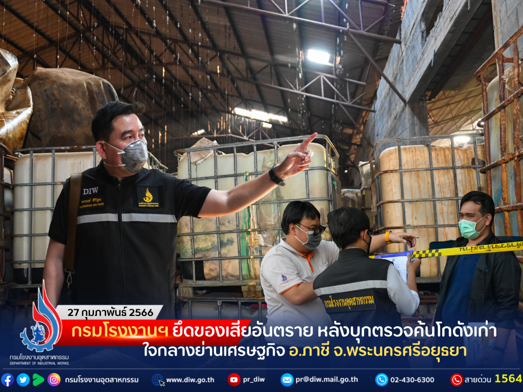 เมื่อวันที่ 27 กุมภาพันธ์ 2566 นายจุลพงษ์ ทวีศรี อธิบดีกรมโรงงานอุตสาหกรรม มอบหมายให้ เจ้าหน้าที่กองบริหารจัดการกากอุตสาหกรรมและกองวิจัยและเตือนภัยมลพิษโรงงาน พร้อมด้วย นายธีระ แก้วพิมล อุตสาหกรรมจังหวัดพระนครศรีอยุธยา ร่วมกับ นางสาวอภิสรา เกษอินทร์ นายอำเภอภาชี เจ้าหน้าที่กระทรวงทรัพยากรธรรมชาติและสิ่งแวดล้อม เจ้าหน้าที่กรมควบคุมมลพิษ สาธารณสุขอำเภอภาชี และเจ้าหน้าที่ตำรวจภูธรภาชี ลงพื้นที่ตรวจสอบอาคารโกดังเก่าต้องสงสัย หลังได้รับแจ้งเบาะแสจากชาวบ้านและเจ้าหน้าที่ในพื้นที่ว่ามีการลักลอบเก็บสารเคมีอันตรายหลายชนิด ซึ่งตั้งอยู่ไม่ห่างจากโรงพยาบาลภาชี ถนนสายบ้านภาชี-หินกอง อำเภอภาชี จังหวัดพระนครศรีอยุธยา