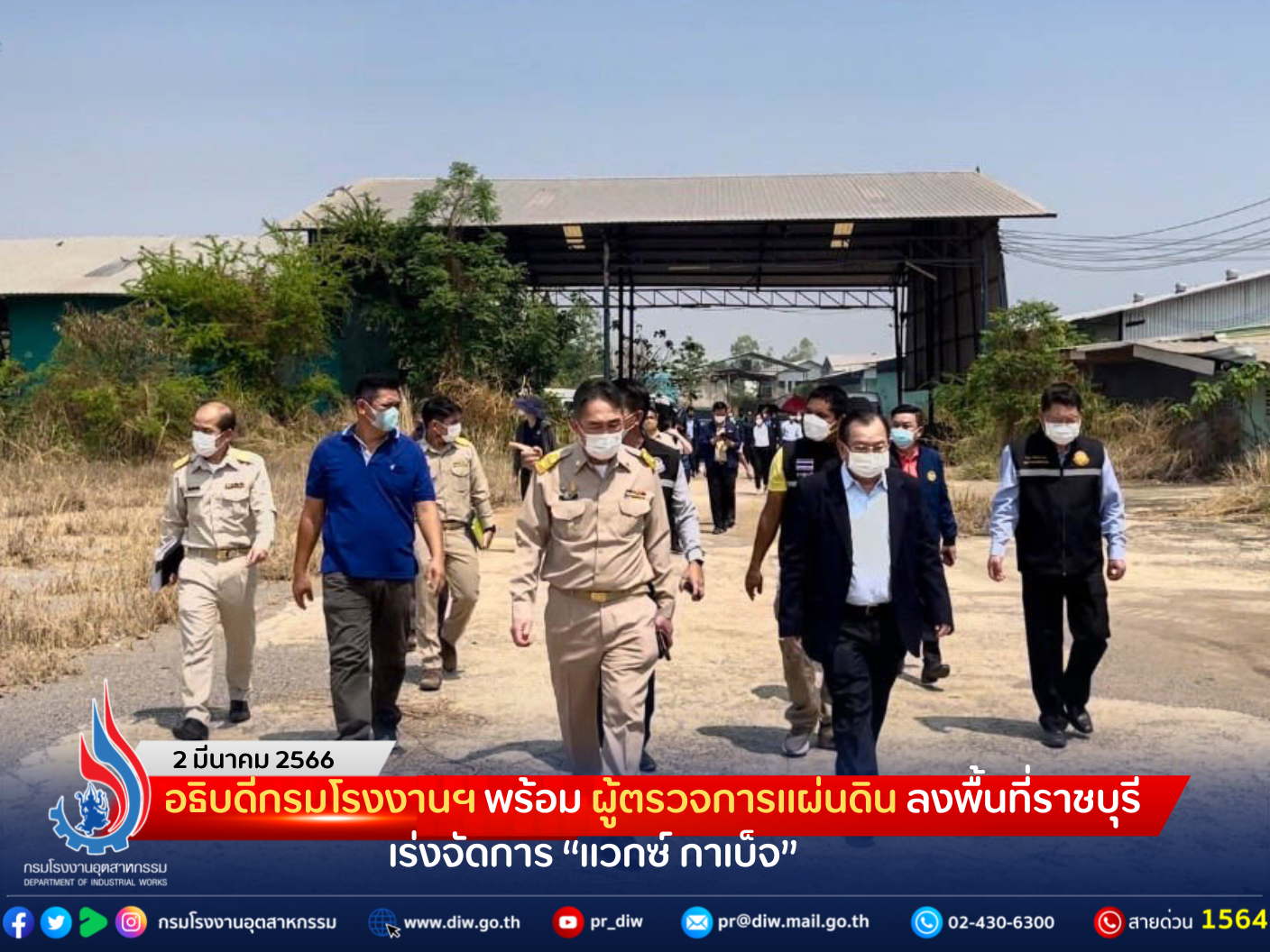 เมื่อวันที่ 2 มีนาคม 2566 เวลา 10.00 น. นายจุลพงษ์ ทวีศรี อธิบดีกรมโรงงานอุตสาหกรรม และ นายทรงศัก สายเชื้อ ผู้ตรวจการแผ่นดิน พร้อมด้วย นางจินดา เตชะศรินทร์ ผู้อำนวยการกองบริหารจัดการกากอุตสาหกรรม นายสุนทร แก้วสว่าง ผู้อำนวยการกองกฎหมาย นางสาววิชุดา สัมฤทธิ์ผล ผู้อำนวยการศูนย์วิจัยและเตือนภัยมลพิษโรงงานภาคตะวันตก นายอานันท์ ฟักสังข์ อุตสาหกรรมจังหวัดราชบุรี ร่วมด้วย นายอังกูร ศีลาเทวากูล รองผู้ว่าราชการจังหวัดราชบุรี สำนักงานทรัพยากรธรรมชาติและสิ่งแวดล้อมจังหวัดราชบุรี สำนักงานสิ่งแวดล้อมภาคที่ 8 (ราชบุรี) สำนักงานทรัพยากรน้ำบาดาล เขต 8 (ราชบุรี) สำนักงานทรัพยากรน้ำภาค 7 และตำรวจภูธรจังหวัดราชบุรี ลงพื้นที่จังหวัดราชบุรี เพื่อเร่งติดตามการแก้ไขปัญหาสารเคมีตกค้างและเยียวยาผู้ได้รับผลกระทบจากการประกอบกิจการโรงงาน บริษัท แวกซ์ กาเบ็จ รีไซเคิล เซ็นเตอร์ จำกัด ตั้งอยู่ที่ ตำบลรางบัว อำเภอจอมบึง จังหวัดราชบุรี ที่ก่อให้เกิดผลกระทบต่อสิ่งแวดล้อมและสุขอนามัยของประชาชนในพื้นที่ ซึ่งนับเป็นการลงพื้นที่ติดตามครั้งที่ 2 ของผู้ตรวจการแผ่นดิน