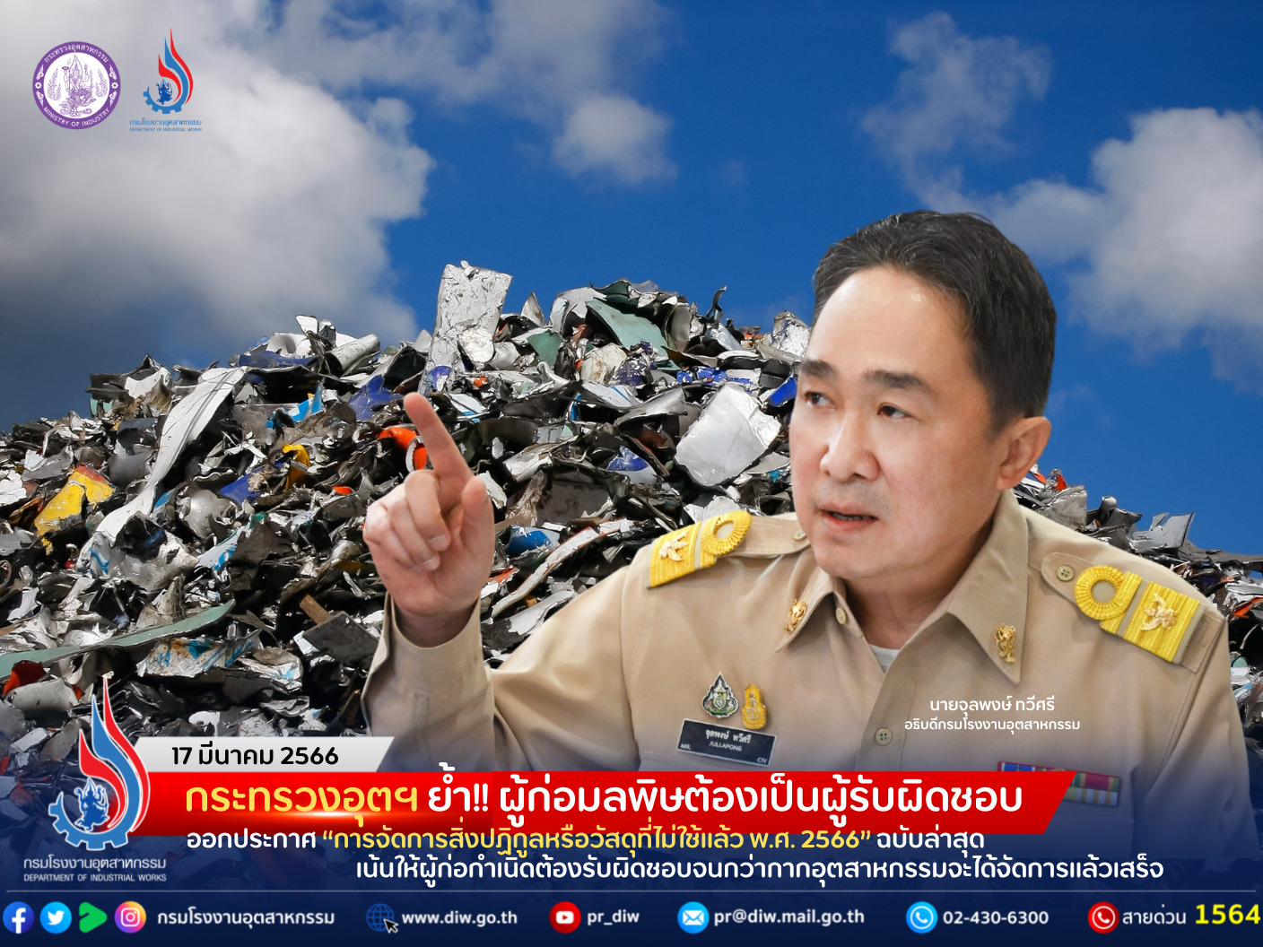 นายจุลพงษ์ ทวีศรี อธิบดีกรมโรงงานอุตสาหกรรม เปิดเผยว่า กระทรวงอุตสาหกรรม (อก.) โดย กรมโรงงานอุตสาหกรรม (กรอ.) ให้ความสำคัญต่อการบริหารจัดการสิ่งปฏิกูลหรือวัสดุที่ไม่ใช้แล้วที่เกิดขึ้นจากการประกอบกิจการโรงงาน จึงได้มีการปรับปรุงประกาศฉบับล่าสุด เรียกว่า “ประกาศกระทรวงอุตสาหกรรม เรื่อง การจัดการสิ่งปฏิกูลหรือวัสดุที่ไม่ใช้แล้ว พ.ศ. 2566” ซึ่งเป็นประกาศที่จะนำหลักการผู้ก่อมลพิษเป็นผู้จ่ายหรือเป็นผู้รับผิดชอบ (Polluter Pays Principle; PPP) มาใช้อย่างเต็มรูปแบบ โดยกำหนดภาระความรับผิด (Liability) ตั้งแต่ต้นทางโรงงานผู้ก่อกำเนิดไปจนกว่าสิ่งปฏิกูลหรือวัสดุที่ไม่ใช้แล้วจะได้รับการจัดการจนเสร็จเรียบร้อย ต่างจากเดิมที่ความรับผิดชอบจะสิ้นสุดเมื่อโรงงานผู้รับกำจัดได้รับมอบสิ่งปฏิกูลหรือวัสดุที่ไม่ใช้แล้วเท่านั้น อีกทั้งยังเป็นการลดขั้นตอนการอนุญาตจัดการสิ่งปฏิกูลหรือวัสดุที่ไม่ใช้แล้วภายในโรงงาน ที่เน้นให้ผู้ประกอบการรายงานข้อมูลหรือรับรองตนเองเท่าที่จำเป็นผ่านระบบรายงานข้อมูลกลางของกระทรวงอุตสาหกรรมเท่านั้น รวมถึงการตรวจสอบข้อมูลต่างๆ จะใช้การกำกับดูแลร่วมกับการใช้ระบบปัญญาประดิษฐ์ (Artificial Intelligence; AI) โดยประกาศนี้มีผลบังคับใช้ตั้งแต่วันที่ 1 พฤศจิกายน 2566 ยกเว้น! การส่งรายงานประจำปีเกี่ยวกับการจัดการสิ่งปฏิกูลหรือวัสดุที่ไม่ใช้แล้ว ทั้งที่เป็นของเสียอันตรายและของเสียไม่อันตรายของโรงงานผู้ก่อกำเนิด และการจัดส่งรายงานประจำเดือนเกี่ยวกับการจัดการวัตถุดิบและผลิตภัณฑ์ของโรงงานผู้รับดำเนินการ ให้มีผลบังคับใช้ทันทีนับถัดจากวันที่ประกาศในราชกิจจานุเบกษา