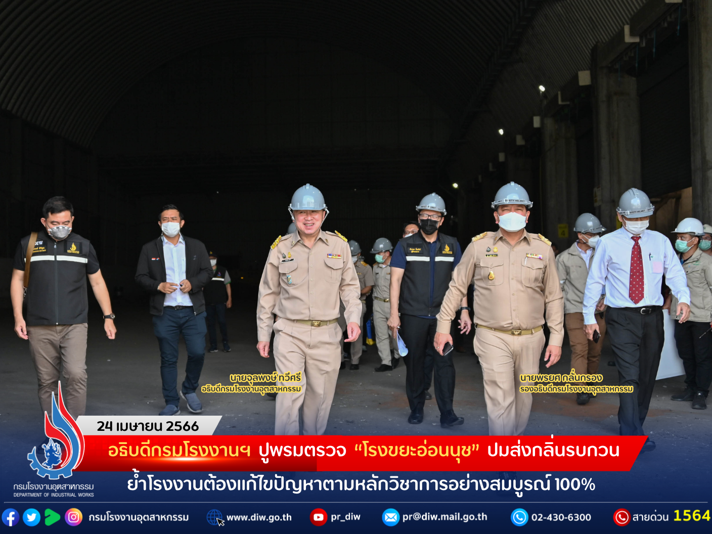 เมื่อวันที่ 24 เมษายน 2566 เวลา 09.00 น. นายจุลพงษ์ ทวีศรี อธิบดีกรมโรงงานอุตสาหกรรม และ นายพรยศ กลั่นกรอง รองอธิบดีกรมโรงงานอุตสาหกรรม ลงพื้นที่ตรวจติดตามการแก้ปัญหาร้องเรียน จากการประกอบกิจการโรงงานของ บริษัท กรุงเทพธนาคม จำกัด ภายใต้โครงการบริหารจัดการมูลฝอยชุมชน 800 ตันต่อวันเพื่อผลิตพลังงานไฟฟ้าจากก๊าซชีวภาพขนาด 4.2 MW ซึ่งบริษัทฯ เป็น “วิสาหกิจของกรุงเทพมหานคร” ได้รับอนุญาตประกอบกิจการโรงงาน 3 ใบอนุญาต ได้แก่ 1) ประเภทโรงงานลำดับ 106 ผลิตเชื้อเพลิงแข็งจากขยะชุมชน 2) ประเภทโรงงานลำดับ 89 ผลิตก๊าซชีวภาพจากน้ำหมักขยะมูลฝอย และ 3) ประเภทโรงงานลำดับ 88 ผลิตไฟฟ้าจากเชื้อเพลิงก๊าซชีวภาพ ตั้งอยู่ที่ ศูนย์กำจัดมูลฝอยอ่อนนุช ซอยอ่อนนุช 86 แยก 1 แขวงประเวศ เขตประเวศ กรุงเทพมหานคร โดยการตรวจในครั้งนี้มี นายประพาส เหลืองศิรินภา ผู้อำนวยการสำนักสิ่งแวดล้อม กรุงเทพมหานคร (สสล.กทม.) นางสาวชฎารัตน์ สุนทรเกตุ ผู้อำนวยการเขต สำนักงานคณะกรรมการกำกับกิจการพลังงาน (กกพ.) ประจำเขต 13 กรุงเทพมหานคร พร้อมด้วย นางจินดา เตชะศรินทร์ ผู้อำนวยการกองบริหารจัดการกากอุตสาหกรรม นายภัทรพล ลิ้มภักดี ผู้อำนวยการกองบริการงานอนุญาตโรงงาน 2 และเจ้าหน้าที่กองวิจัยและเตือนภัยมลพิษโรงงาน ร่วมลงพื้นที่ด้วย