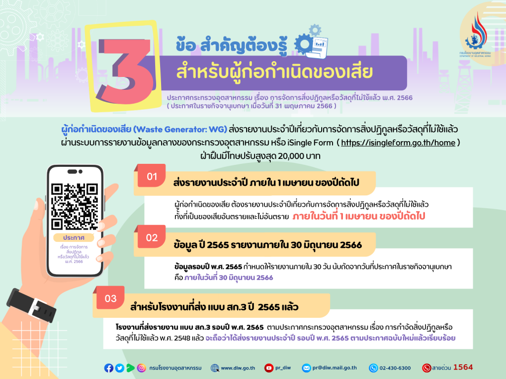 #กรมโรงงานอุตสาหกรรม #กรมโรงงาน #กรอ #DIW #MIND #กระทรวงอุตสาหกรรม #กากอุตสาหกรรม #ประกาศล่าสุด #ประกาศกระทรวงอุตสาหกรรม #ผู้ก่อมลพิษเป็นผู้จ่าย #ผู้ก่อกำเนิดของเสีย #ผู้รับบำบัดกำจัดของเสีย #WasteGenerator #WasteProcessor #iSingleForm #ระบบการรายงานข้อมูลกลางของกระทรวงอุตสาหกรรม