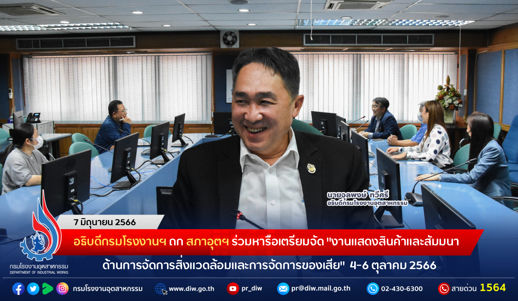 วันที่ 7 มิถุนายน 2566 นายจุลพงษ์ ทวีศรี อธิบดีกรมโรงงานอุตสาหกรรม ประชุมหารือร่วมกับ นายธีระพล ติรวศิน ประธานกลุ่มอุตสาหกรรมการจัดการเพื่อสิ่งแวดล้อม สภาอุตสาหกรรมแห่งประเทศไทย เพื่อแลกเปลี่ยนข้อคิดเห็นเกี่ยวกับแนวทางการจัดงานแสดงสินค้าและสัมมนาด้านการจัดการสิ่งแวดล้อมและการจัดการของเสีย (Environmental and Waste Management Expo 2023 : EnwastExpo) โดยมี นายเอกบุตร อุตมพงศ์ รักษาการนักวิทยาศาสตร์เชี่ยวชาญ กองส่งเสริมเทคโนโลยีความปลอดภัยโรงงาน และ นางสาวรัตติกาล ธรรมปัญญา ผู้อำนวยการกลุ่มวิชาการและการขนส่ง กองบริหารจัดการกากอุตสาหกรรม พร้อมด้วย เจ้าหน้าที่จากสภาอุตสาหกรรมแห่งประเทศไทย เข้าร่วมประชุม ณ ห้องประชุม 503 ชั้น 5 อาคารกรมโรงงานอุตสาหกรรม
