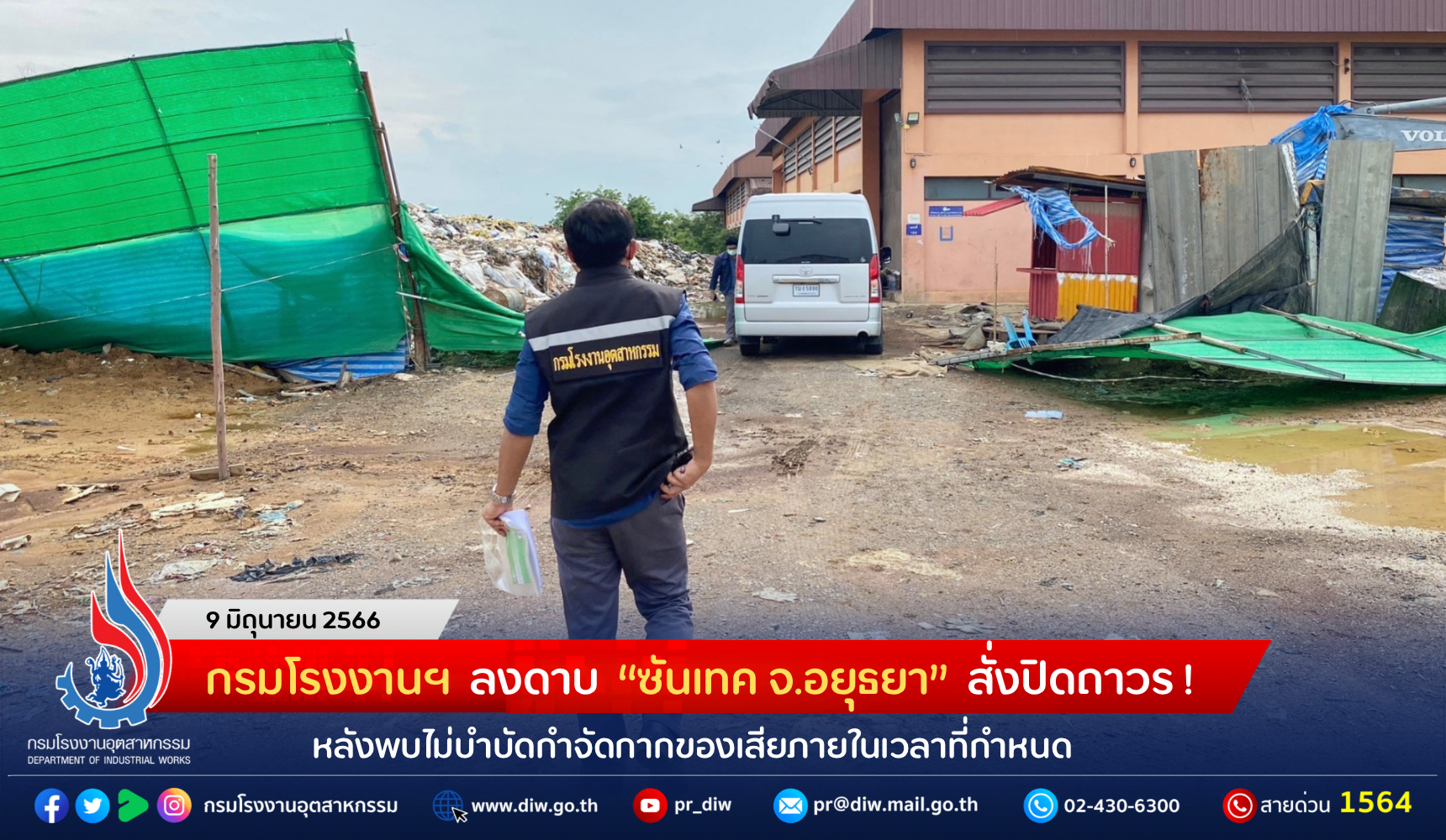 เมื่อวันที่ 9 มิถุนายน 2566 นายจุลพงษ์ ทวีศรี อธิบดีกรมโรงงานอุตสาหกรรม มอบหมายให้เจ้าหน้าที่กองบริหารจัดการกากอุตสาหกรรม กรมโรงงานอุตสาหกรรม (กรอ.) พร้อมด้วย นายธีระ แก้วพิมล อุตสาหกรรมจังหวัดพระนครศรีอยุธยา ลงพื้นที่โกดังของ บริษัท ซันเทค เคมิคอล แอนด์ โลจิสติกส์ จำกัด ตั้งอยู่บนถนนอุทัย–ภาชี ตำบลอุทัย อำเภออุทัย จังหวัดพระนครศรีอยุธยา เพื่อติดประกาศคำสั่งปิดโรงงานบริษัทฯ อย่างถาวร