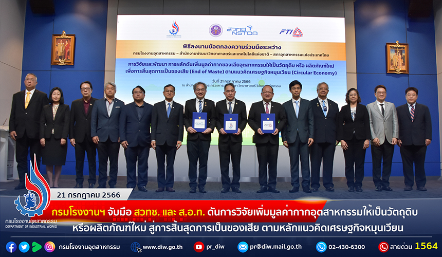 วันที่ 21 กรกฎาคม 2566 ดร.จุลพงษ์ ทวีศรี อธิบดีกรมโรงงานอุตสาหกรรม ศาสตราจารย์ ดร.ชูกิจ ลิมปิจำนงค์ ผู้อำนวยการสำนักงานพัฒนาวิทยาศาสตร์และเทคโนโลยีแห่งชาติ (สวทช.) และนายเกรียงไกร เธียรนุกุล ประธานสภาอุตสาหกรรมแห่งประเทศไทย (ส.อ.ท.) ลงนามความร่วมมือด้านการวิจัยและพัฒนาการผลักดันเพิ่มมูลค่ากากอุตสาหกรรมให้เป็นวัตถุดิบหรือผลิตภัณฑ์ใหม่ โดยมีมาตรฐานการควบคุมที่เหมาะสมทั้งในเชิงวิชาการ ความปลอดภัยต่อสิ่งแวดล้อม เพื่อการสิ้นสุดการเป็นของเสีย (End of Waste) ต่อยอดงานวิจัยสู่การใช้ประโยชน์ได้จริงและพัฒนาสู่เชิงพาณิชย์ ณ ห้องแถลงข่าว กระทรวงการอุดมศึกษา วิทยาศาสตร์ วิจัยและนวัตกรรม (อว.)