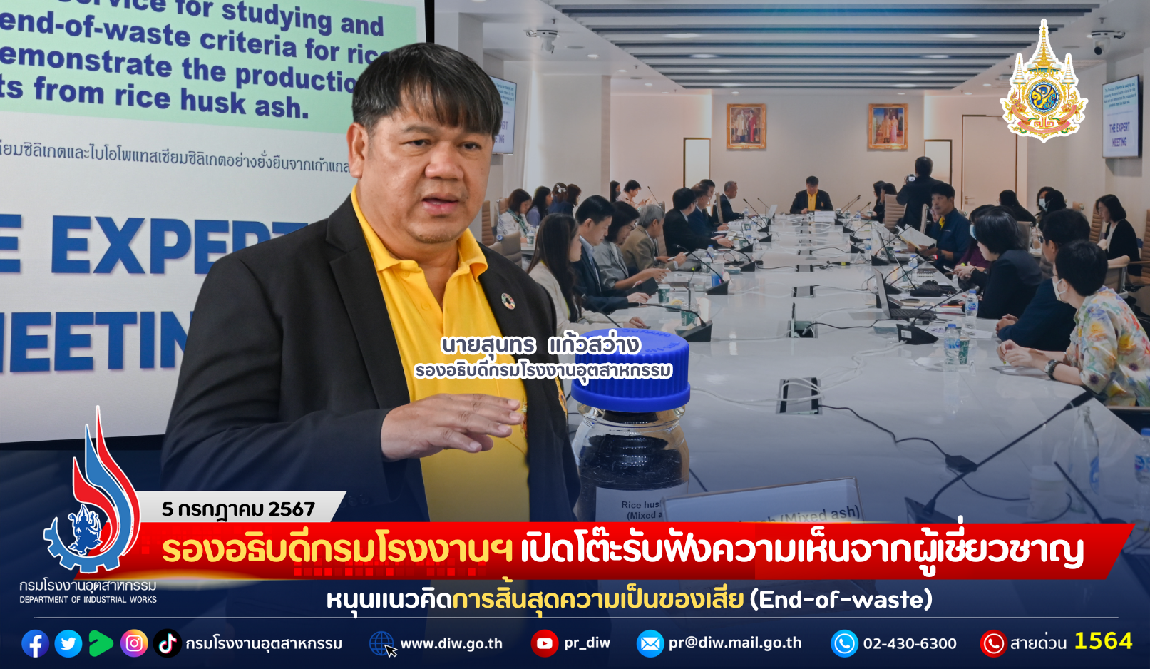 วันที่ 5 กรกฎาคม 2567 เวลา 09.30 น. นายสุนทร แก้วสว่าง รองอธิบดีกรมโรงงานอุตสาหกรรม เป็นประธานเปิดการประชุมคณะผู้เชี่ยวชาญ (Expert) ของโครงการ Provision of services for studying and preparing the end-of-waste criteria for rice husk ash and demonstrate the production of products from rice husk ash เพื่อร่วมให้ข้อคิดเห็น คำแนะนำ และแลกเปลี่ยนความคิดเห็นจากคณะผู้เชี่ยวชาญให้แก่ทีมวิจัยในการดำเนินงานให้บรรลุตามวัตถุประสงค์โครงการ และเพื่อเป็นข้อมูลสำคัญนำไปสู่การผลักดันการสิ้นสุดความเป็นของเสีย (End-of-waste) ของขี้เถ้าแกลบ โดยมี นางสาวปัทมวรรณ คุณประเสริฐ ผู้อำนวยการกองส่งเสริมเทคโนโลยีสิ่งแวดล้อมโรงงาน กรมโรงงานอุตสาหกรรม (กรอ.) ดร.อุมา วิรัตน์สกุลชัย ผู้ประสานงานโครงการ องค์การพัฒนาอุตสาหกรรมแห่งสหประชาชาติ หรือ UNIDO (United Nations Industrial Development Organization) คณะผู้เชี่ยวชาญ และคณะทำงานด้านเทคนิคสำหรับส่งเสริมการใช้ประโยชน์จากกากอุตสาหกรรมและการพัฒนาอุตสาหกรรมสีเขียว เข้าร่วมประชุม ณ ห้องประชุม YT-711 อาคารสำนักงานพัฒนาวิทยาศาสตร์และเทคโนโลยีแห่งชาติ (สวทช.) เขตราชเทวี กรุงเทพมหานคร