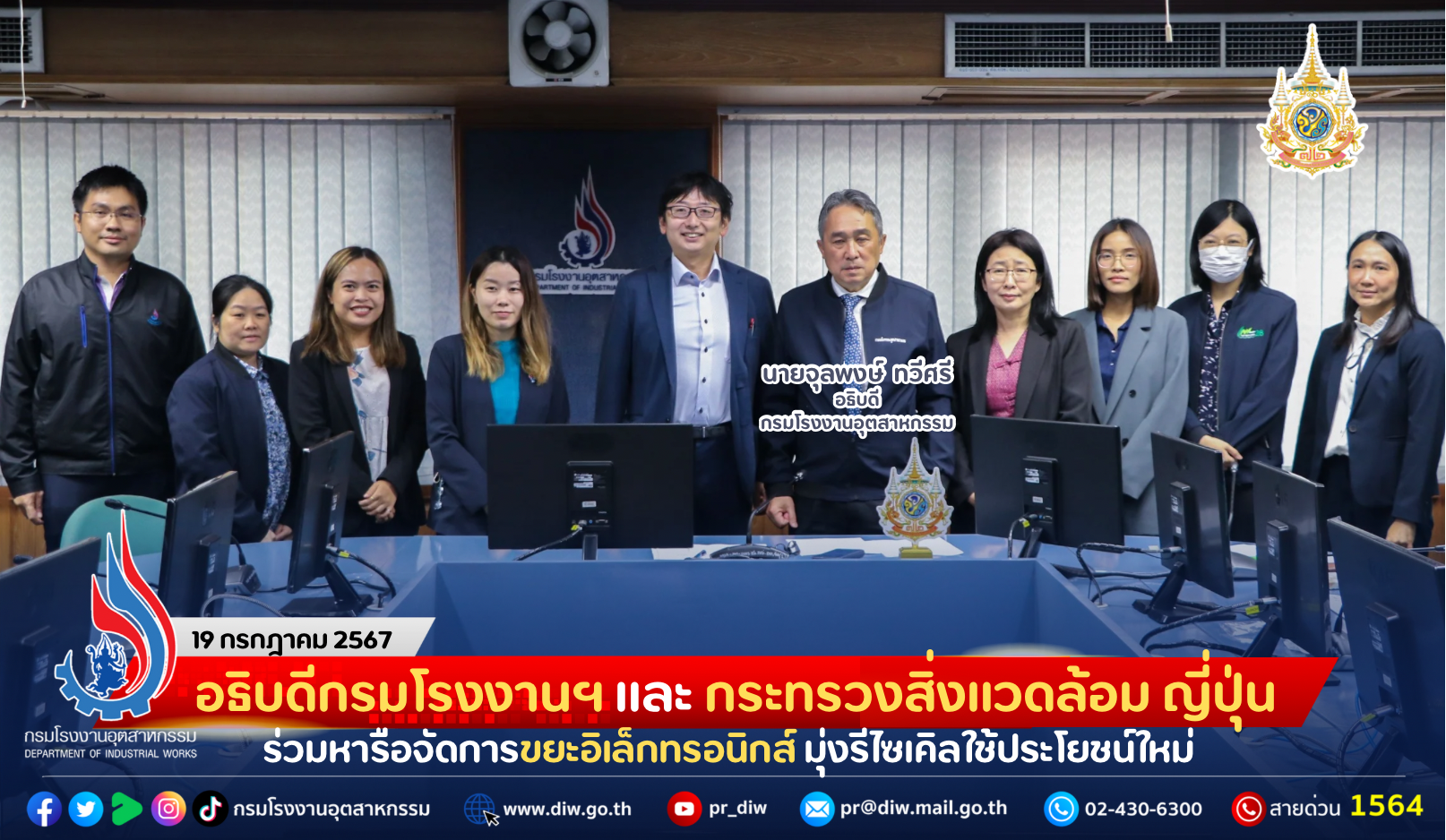 วันที่ 19 กรกฎาคม 2567 เวลา 14.30 น. นายจุลพงษ์ ทวีศรี อธิบดีกรมโรงงานอุตสาหกรรม ประชุมร่วมหารือความร่วมมือทวิภาคี ระหว่าง กรมโรงงานอุตสาหกรรม กระทรวงอุตสาหกรรม กับ สำนักฟื้นฟูสิ่งแวดล้อมและวัฏจักรของวัสดุ กระทรวงสิ่งแวดล้อม ประเทศญี่ปุ่น เพื่อพัฒนาแนวคิด นวัตกรรม ที่เหมาะสมต่อการจัดการขยะอิเล็กทรอนิกส์ สู่การหมุนเวียนทรัพยากรและการจัดการของเสียอย่างมีประสิทธิภาพ โดยมี Mr. Satoshi Yoshida Director for International Resource Circulation กระทรวงสิ่งแวดล้อม ประเทศญี่ปุ่น Ms. Osawa Yurie เลขานุการเอก สถานเอกอัครราชทูตญี่ปุ่นประจำประเทศไทย นางสาวปัทมวรรณ คุณประเสริฐ ผู้อำนวยการกองส่งเสริมเทคโนโลยีสิ่งแวดล้อมโรงงาน เจ้าหน้าที่กรมโรงงานอุตสาหกรรม เจ้าหน้าที่กระทรวงสิ่งแวดล้อมประเทศญี่ปุ่น และ เจ้าหน้าที่สถาบัน EX Research Institute หรือ EXRI ASIA (ประเทศญี่ปุ่น) เข้าร่วมประชุม ณ ห้องประชุม 503 ชั้น 5 อาคารกรมโรงงานอุตสาหกรรม และประชุมผ่านระบบอิเล็กทรอนิกส์