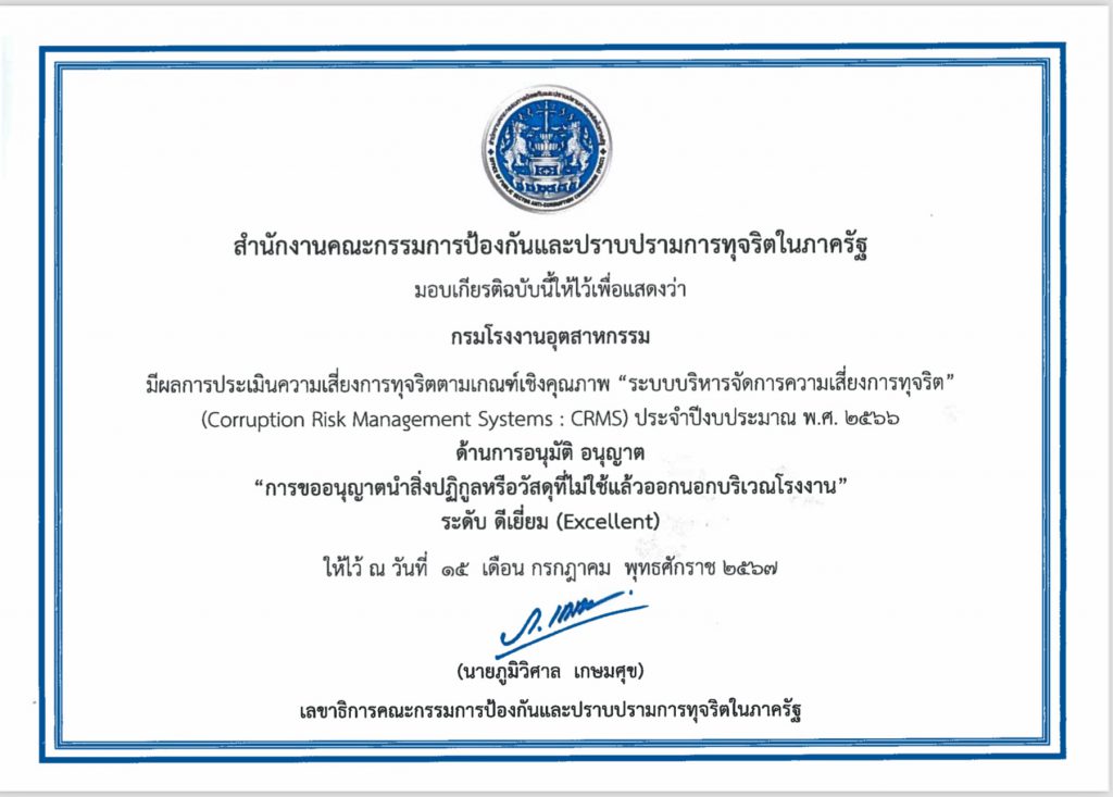 นายจุลพงษ์ ทวีศรี อธิบดีกรมโรงงานอุตสาหกรรม เปิดเผยว่า เมื่อวันที่ 15 กรกฎาคม 2567 สำนักงานคณะกรรมการป้องกันและปราบปรามการทุจริตในภาครัฐ (สำนักงาน ป.ป.ท.) ได้ประกาศผลการประเมินความเสี่ยงการทุจริตตามเกณฑ์เชิงคุณภาพ “ระบบบริหารจัดการความเสี่ยงการทุจริต” (Corruption Risk Management Systems : CRMS) ประจำปีงบประมาณ พ.ศ. 2566 “ด้านการอนุมัติ อนุญาต การขออนุญาตนำสิ่งปฏิกูลหรือวัสดุที่ไม่ใช้แล้วออกนอกบริเวณโรงงาน” ผลปรากฏ กรมโรงงานอุตสาหกรรม (กรอ.) ได้ระดับผลการประเมินเชิงคุณภาพ ระบบการบริหารจัดการความเสี่ยงการทุจริต” ได้คะแนนสูงกว่า 80 คะแนน จัดอยู่ในระดับ “ดีเยี่ยม”