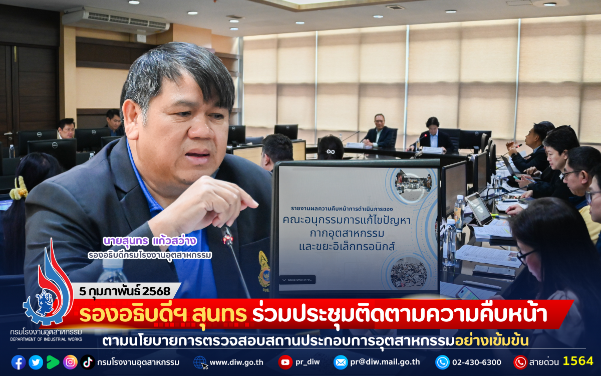 วันที่ 5 กุมภาพันธ์ 2568 เวลา 09.30 น. นายสุนทร แก้วสว่าง รองอธิบดีกรมโรงงานอุตสาหกรรม พร้อมด้วย นางสาวศิรกาญจน์ เหลืองสกุล ผู้อำนวยการกองส่งเสริมเทคโนโลยีสิ่งแวดล้อมโรงงาน และนางสาวนวพร สงวนหมู่ ผู้อำนวยการกองบริหารจัดการกากอุตสาหกรรม เข้าร่วมประชุมคณะกรรมการตรวจสอบการประกอบการอุตสาหกรรมอย่างเข้มข้น ครั้งที่ 2/2568 เพื่อติดตามความคืบหน้าตามนโยบายการตรวจสอบสถานประกอบการอุตสาหกรรมอย่างเข้มข้นของกระทรวงอุตสาหกรรม โดยมี นางสาวฐิติภัสร์ โชติเดชาชัยนันต์ หัวหน้าคณะทำงานรัฐมนตรีว่าการกระทรวงอุตสาหกรรม และนายเอกนิติ รมยานนท์ ผู้ตรวจราชการกระทรวงอุตสาหกรรม ร่วมเป็นประธานการประชุม ร่วมด้วย ผู้บริหารและเจ้าหน้าที่จากหน่วยงานที่เกี่ยวข้องเข้าร่วมประชุม ณ ห้องประชุม อก.3 ชั้น 3 อาคารสำนักงานปลัดกระทรวงอุตสาหกรรม