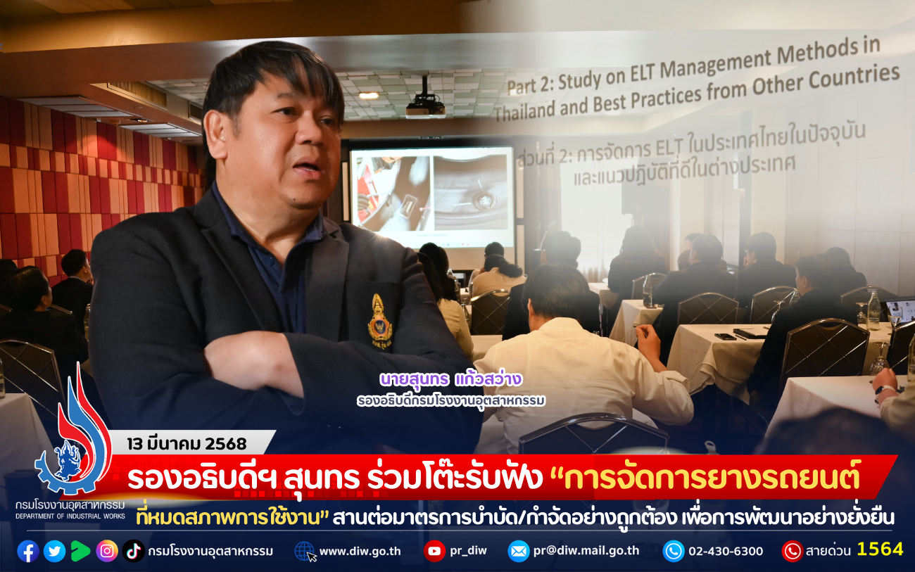 วันที่ 13 มีนาคม 2568 เวลา 09.00 น. นายสุนทร แก้วสว่าง รองอธิบดีกรมโรงงานอุตสาหกรรม และนางสาวจิตติยา ชูทอง ผู้อำนวยการกลุ่มจัดการกากอุตสาหกรรม 3 กองบริหารจัดการกากอุตสาหกรรม เข้าร่วมประชุมรับฟังความคิดเห็นต่อผลการศึกษา “โครงการวิจัยการจัดการยางรถยนต์ที่หมดสภาพการใช้งาน (End-of-Life Tyre: ELT) ของประเทศไทย” เพื่อเป็นแนวทางการจัดการ ELT ที่ต้องได้รับการบำบัดหรือกำจัดอย่างถูกต้อง ปลอดภัย ไม่ส่งผลกระทบต่อสิ่งแวดล้อม โดยมี นายโทรุ นากามุระ นายกสมาคมผู้ผลิตยางรถยนต์ไทย กล่าวต้อนรับและเปิดการประชุม ณ โรงแรมสยาม แอท สยาม ดีไซน์ โฮเทล กรุงเทพฯ